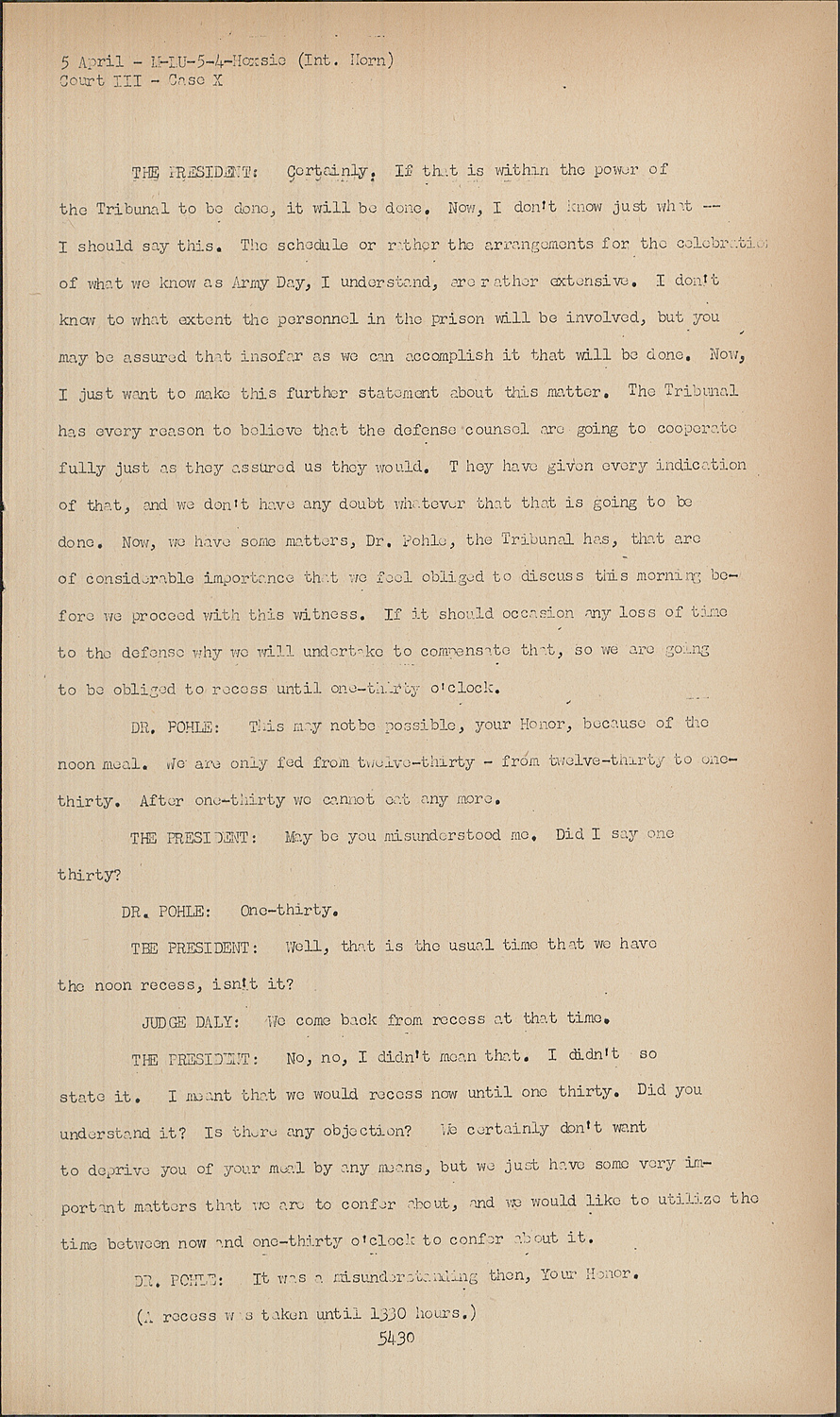 THE PRESIDENT:Certainly. If that is within the power of the Tribunal to be done, it will be done. Now, I don't know just what -I should say this. The schedule or rather the arrangements for the celebration of what we know as Army Day, I understand, are rather extensive. I don't know to what extent the personnel in the prison will be involved, but you may be assured that insofar as we can accomplish it that will be done. Now, I just want to make this further statement about this matter. The Tribunal has every reason to believe that the defense counsel are going to cooperate fully just as they assured us they would. T hey have given every indication of that, and we don't have any doubt whatever that that is going to be done. Now, we have some matters, Dr. Pohle, the Tribunal has, that are of considerable importance that we feel obliged to discuss this morning before we proceed with this witness. If it should occasion any loss of time to the defense why we will undertake to compensate that, so we are going to be obliged to recess until one-thirty o'clock.