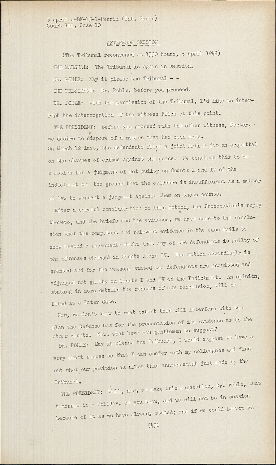 THE PRESIDENT:Before you proceed with the other witness, Doctor, we desire to dispose of a motion that has been made. On March 12 last, the defendants filed a joint motion for an acquittal on the charges of crimes against the peace. We construe this to be a motion for a judgment of not guilty on Counts I and IV of the indictment on the ground that the evidence is insufficient as a matter of law to warrant a judgment against them on those counts.