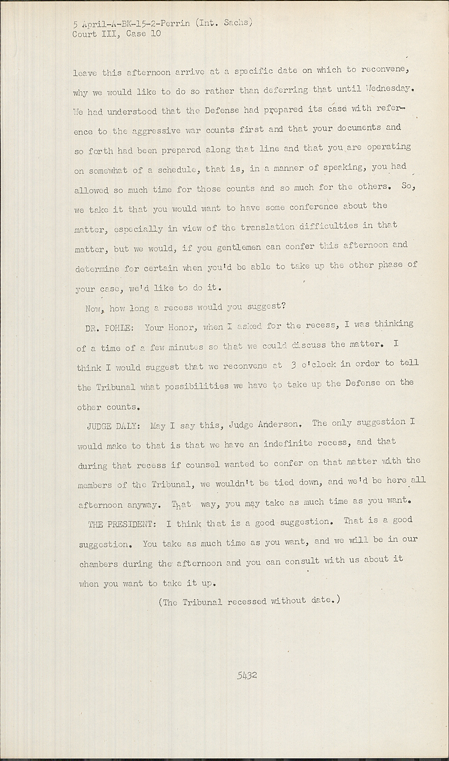 We had understood that the Defense had prepared its case with reference to the aggressive war counts first and that your documents and so forth had been prepared along that line and that you are operating on somewhat of a schedule, that is, in a manner of speaking, you had allowed so much time for those counts and so much for the others. So, we take it that you would want to have some conference about the matter, especially in view of the translation difficulties in that matter, but we would, if you gentlemen can confer this afternoon and determine for certain when you'd be able to take up the other phase of your case, we'd like to do it.