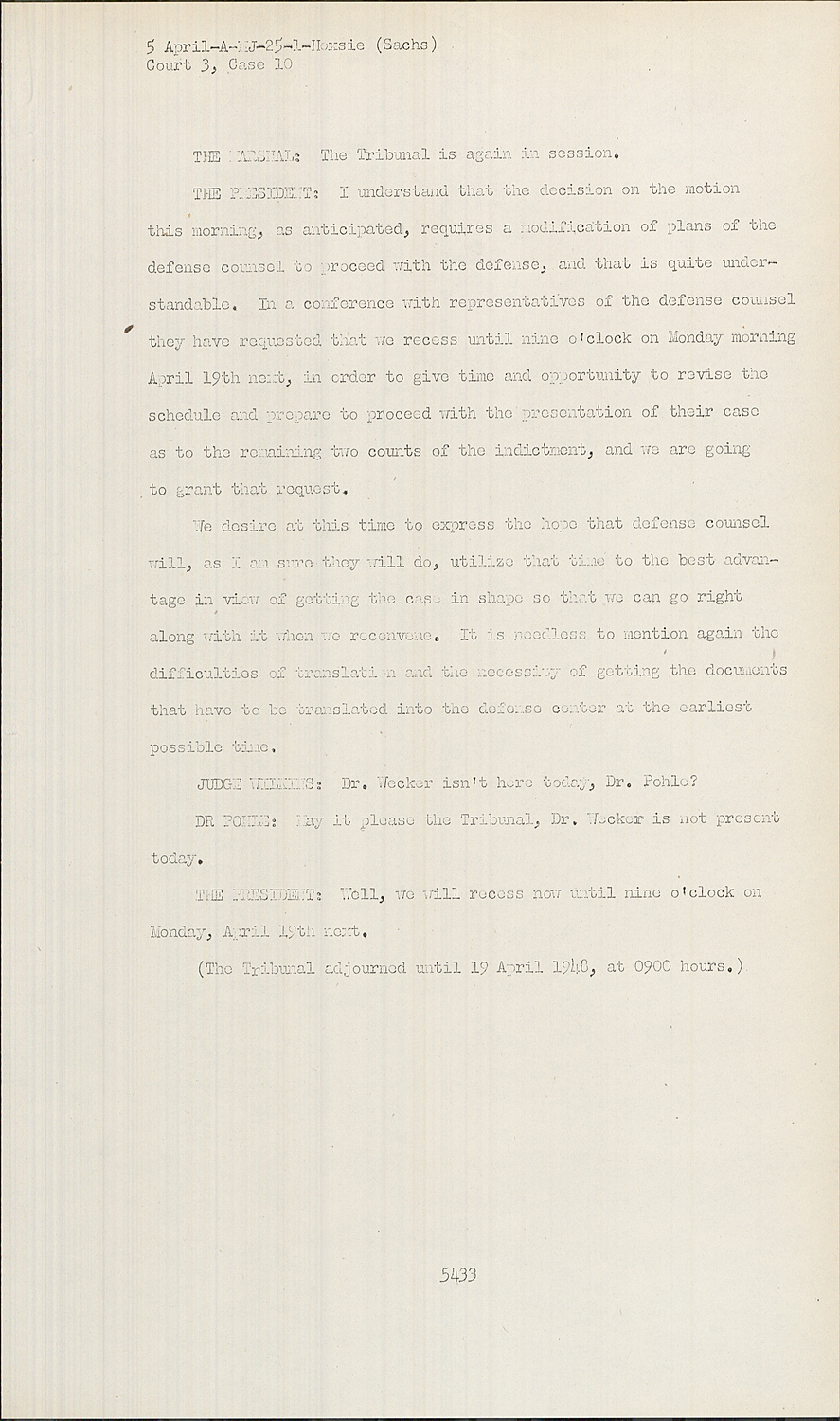 THE PRESIDENT:Well, now, we make this suggestion, Dr. Pohle, that tomorrow is a holiday, as you know, and we will not be in session because of it as we have already stated; and if we could before we leave this afternoon arrive at a specific date on which to reconvene, why we would like to do so rather than deferring that until Wednesday.