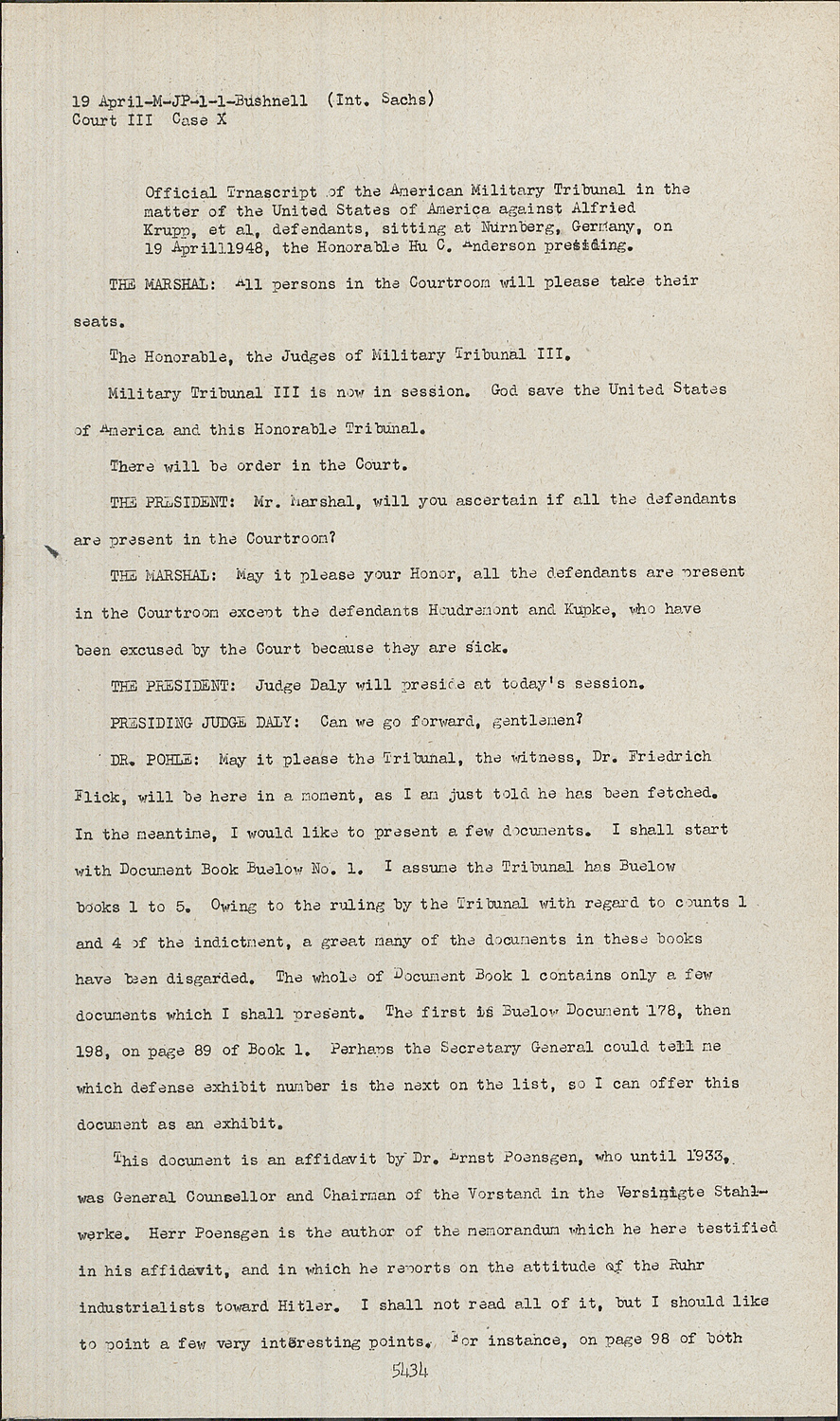 Official Trnascript of the American Military Tribunal in the matter of the United States of America against Alfried Krupp, et al, defendants, sitting at Nurnberg, Germany, on 19 April 1948, the Honorable Hu C. Anderson presiding.