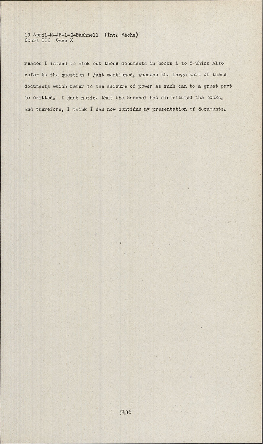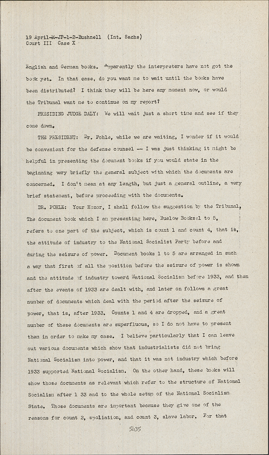 DR. POHLE:Your Honor, I shall follow the suggestion by the Tribunal. The document book which I am presenting here, Buelow Books 1 to 5, refers to one part of the subject, which is count 1 and count 4, that is, the attitude of industry to the National Socialist Party before and during the seizure of power. Document books 1 to 5 are arranged in such a way that first of all the position before the seizure of power is shown and the attitude of industry toward National Socialism before 1933, and then after the events of 1933 are dealt with, and later on follows a great number of documents which deal with the period after the seizure of power, that is, after 1933. Counts 1 and 4 are dropped, and a great number of these documents are superfluous, so I do not have to present them in order to make my case. I believe particularly that I can leave out various documents which show that industrialists did not bring National Socialism into power, and that it was not industry which before 1933 supported National Socialism. On the other hand, these books will show those documents as relevant which refer to the structure of National Socialism after 1 33 and to the whole setup of the National Socialism State. Those documents are important because they give one of the reasons for count 2, spoliation, and count 3, slave labor. For that reason I intend to pick out those documents in books 1 to 5 which also refer to the question I just mentioned, whereas the large part of these documents which refer to the seizure of power as such can to a great part be omitted.