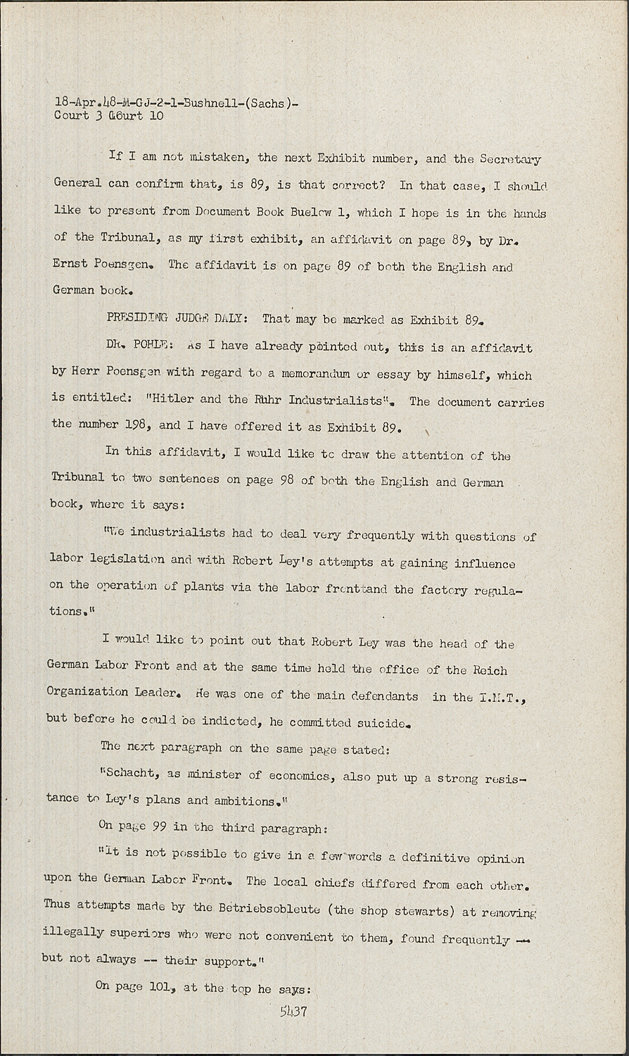 DR. POHLE:As I have already pointed out, this is an affidavit by Herr Poensgen with regard to a memorandum or essay by himself, which is entitled: "Hitler and the Ruhr Industrialists". The document carries the number 198, and I have offered it as Exhibit 89.