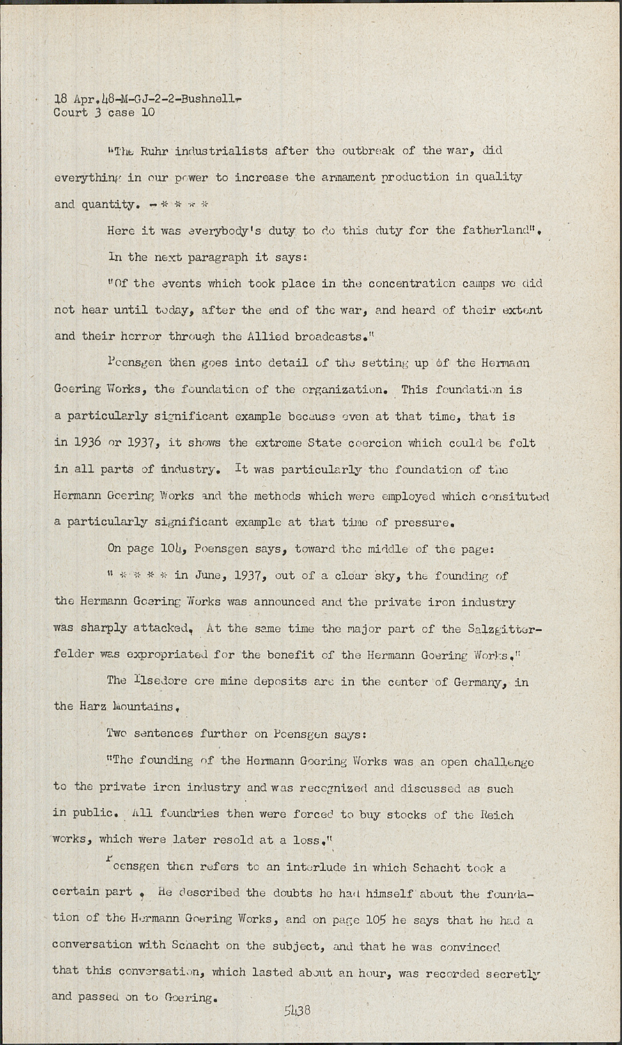 Poensgen then goes into detail of the setting up of the Hermann Goering Works, the foundation of the organization. This foundation is a particularly significant example because even at that time, that is in 1936 or 1937, it shows the extreme State coercion which could be felt in all parts of industry. It was particularly the foundation of the Hermann Goering Works and the methods which were employed which consituted a particularly significant example at that time of pressure.