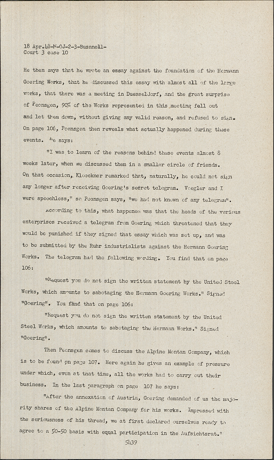 According to this, what happened was that the heads of the various enterprises received a telegram from Goering which threatened that they would be punished if they signed that essay which was set up, and was to be submitted by the Ruhr industrialists against the Hermann Goering Works. The telegram had the following wording. You find that on page 106: