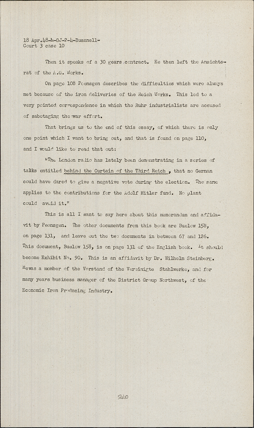 This is all I want to say here about this memorandum and affidavit by Peonsgen. The other documents from this book are Buelow 158, on page 131, and leave out the two documents in between 67 and 126. This document, Buelow 158, is on page 131 of the English book. It should become Exhibit No. 90. This is an affidavit by Dr. Wilhelm Steinberg. He was a member of the Vorstand of the Vereinigte Stahlwerke, and for many years business manager of the District Group Northwest, of the Economic Iron Producing Industry.