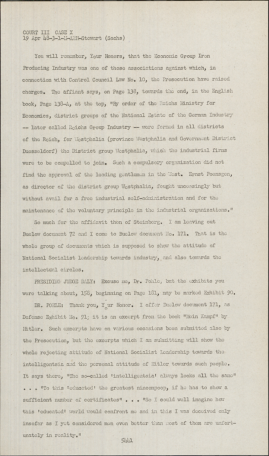 DR. POHLE:Thank you, Your Honor. I offer Buelow document 171, as Defense Exhibit No. 91, it is an excerpt from the book "Mein Kampf" by Hitler. Such excerpts have on various occasions been submitted also by the Prosecution, but the excerpts which I am submitting will show the whole rejecting attitude of National Socialist Leadership towards the intelligentsia and the personal attitude of Hitler towards such people. It says there, "The so-called 'intelligentsia' always looks all the same" . . . "To this 'educated' the greatest nincompoop, if he has to show a sufficient number of certificates" . . . "So I could well imagine how this 'educated' world would confront me and in this I was deceived only insofar as I yet considered men even better than most of them are unfortunately in reality."