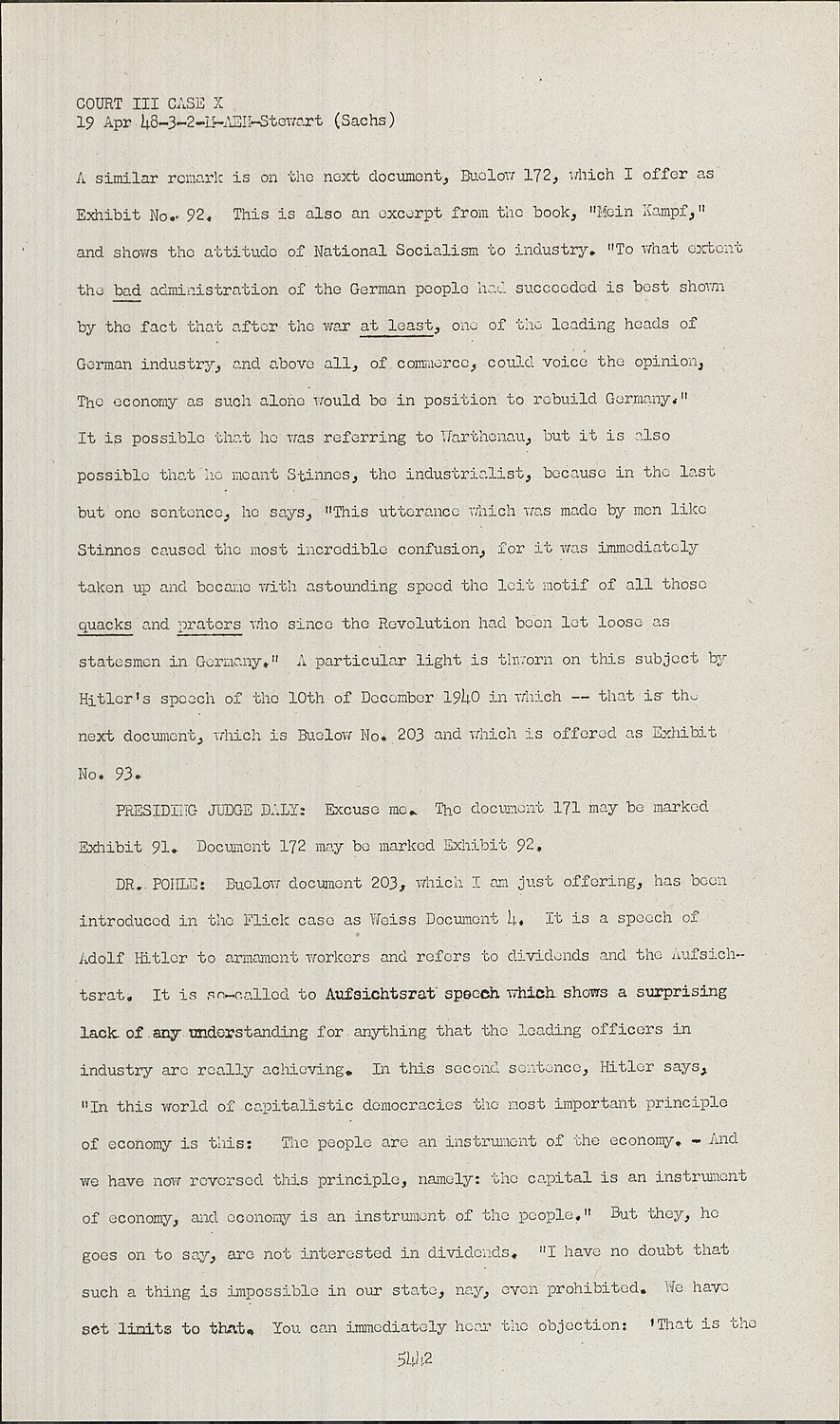 COURT III CASE X A similar remark is on the next document, Buelow 172, which I offer as Exhibit No. 92. This is also an excerpt from the book, "Mein Kampf," and shows the attitude of National Socialism to industry. "To what extent the bad administration of the German people had succeeded is best shown by the fact that after the war at least, one of the leading heads of German industry, and above all, of commerce, could voice the opinion, The economy as such alone would be in position to rebuild Germany," It is possible that he was referring to Warthenau, but it is also possible that he meant Stinnes, the industrialist, because in the last but one sentence, he says, "This utterance which was made by men like Stinnes caused the most incredible confusion, for it was immediately taken up and became with astounding speed the leit motif of all those quacks and praters who since the Revolution had been let loose as statesmen in Germany." A particular light is thworn on this subject by Hitler's speech of the 10th of December 1940 in which -- that is the next document, which is Buelow No. 203 and which is offered as Exhibit No. 93.