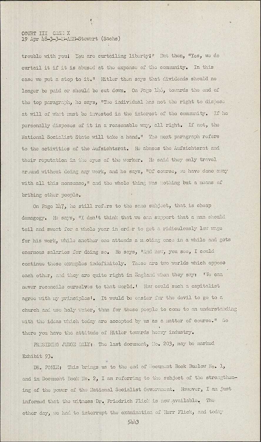 DR. POHLE:Buelow document 203, which I am just offering, has been introduced in the Flick case as Weiss Document 4. It is a speech of Adolf Hitler to armament workers and refers to dividends and the Aufsichtsrat. It is so-called to Aufsichtsrat speech which shows a surprising lack of any understanding for anything that the leading officers in industry are really achieving. In this second sentence, Hitler says, "In this world of capitalistic democracies the most important principle of economy is this: The people are an instrument of the economy. - And we have now reversed this principle, namely: the capital is an instrument of economy, and economy is an instrument of the people," But they, he goes on to say, are not interested in dividends. "I have no doubt that such a thing is impossible in our state, nay, even prohibited. We have set limits to that. You can immediately hear the objection: 'That is the COURT III CASE X trouble with you' You are curtailing liberty'" But then, "Yes, we do curtail it if it is abused at the expense of the community.