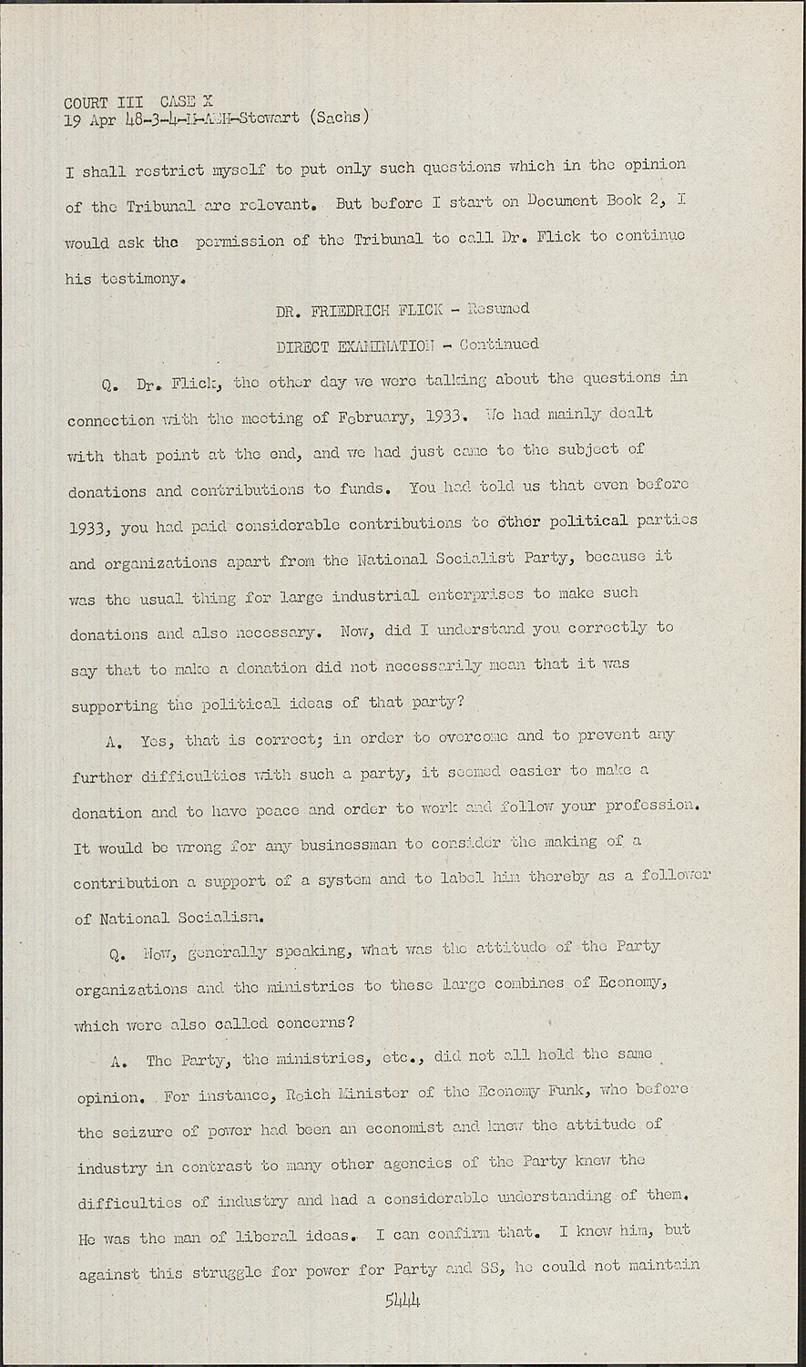 Q.Dr. Flick, the other day we were talking about the questions in connection with the meeting of February, 1933. We had mainly dealt with that point at the end, and we had just came to the subject of donations and contributions to funds. You had told us that even before 1933, you had paid considerable contributions to other political parties and organizations apart from the National Socialist Party, because it was the usual thing for large industrial enterprises to make such donations and also necessary. Now, did I understand you correctly to say that to make a donation did not necessarily mean that it was supporting the political ideas of that party?