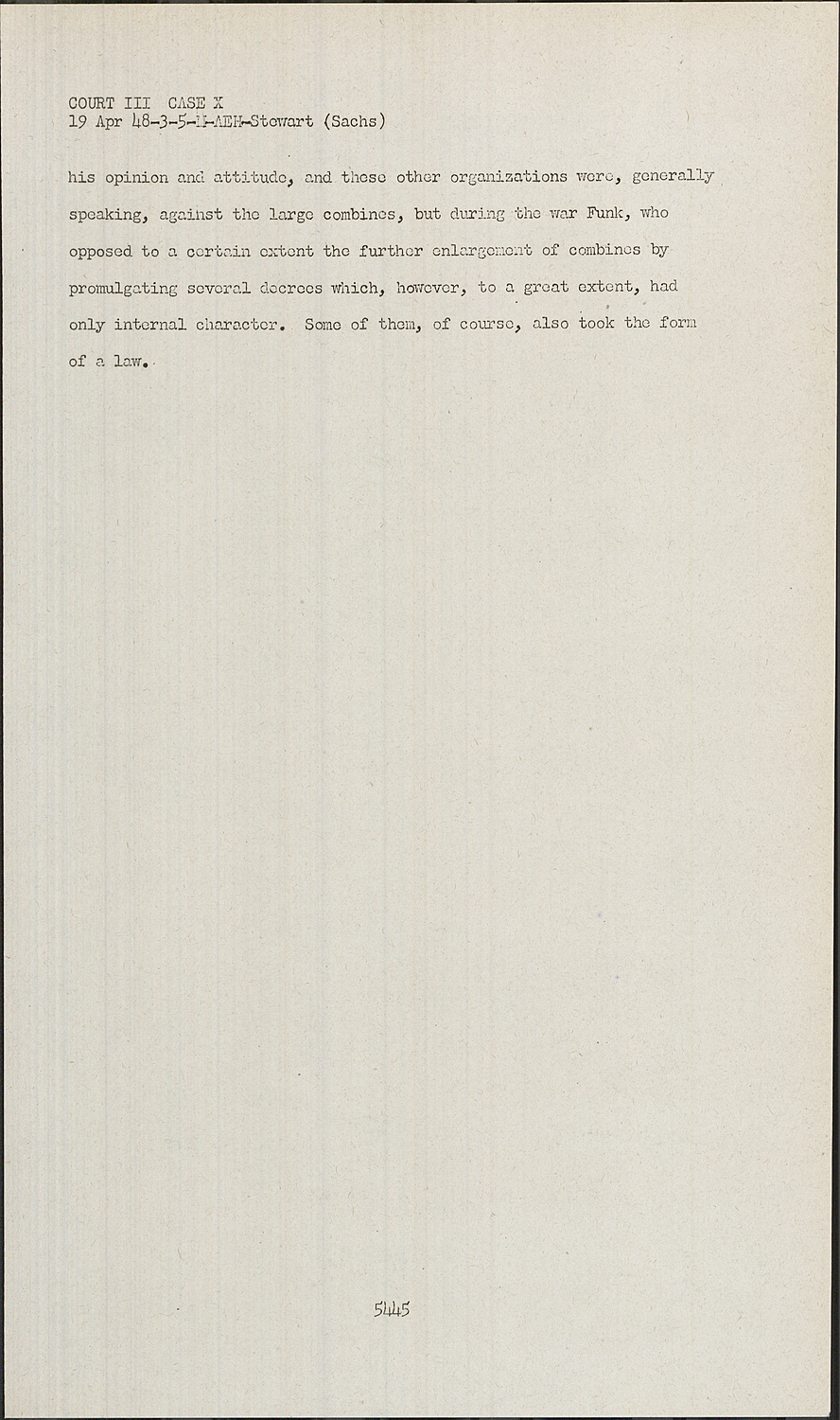 A.The Party, the ministries, etc., did not all hold the same opinion. For instance, Reich Minister of the Economy Funk, who before the seizure of power had been an economist and knew the attitude of industry in contrast to many other agencies of the Party knew the difficulties of industry and had a considerable understanding of them. He was the man of liberal ideas. I can confirm that. I knew him, but against this struggle for power for Party and SS, he could not maintain COURT III CASE X his opinion and attitude, and these other organizations were, generally speaking, against the large combines, but during the war Funk, who opposed to a certain extent the further enlargement of combines by promulgating several decrees which, however, to a great extent, had only internal character.