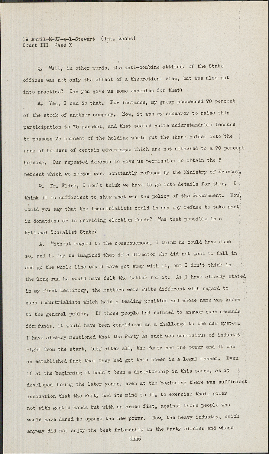 A.Yes, I can do that. For instance, my group possessed 70 percent of the stock of another company. Now, it was my endeavor to raise this participation to 75 percent, and that seemed quite understandable because to possess 75 percent of the holding would put the share holder into the rank of holders of certain advantages which ore not attached to a 70 percent holding. Our repeated demands to give us permission to obtain the 5 percent which we needed were constantly refused by the Ministry of Economy.