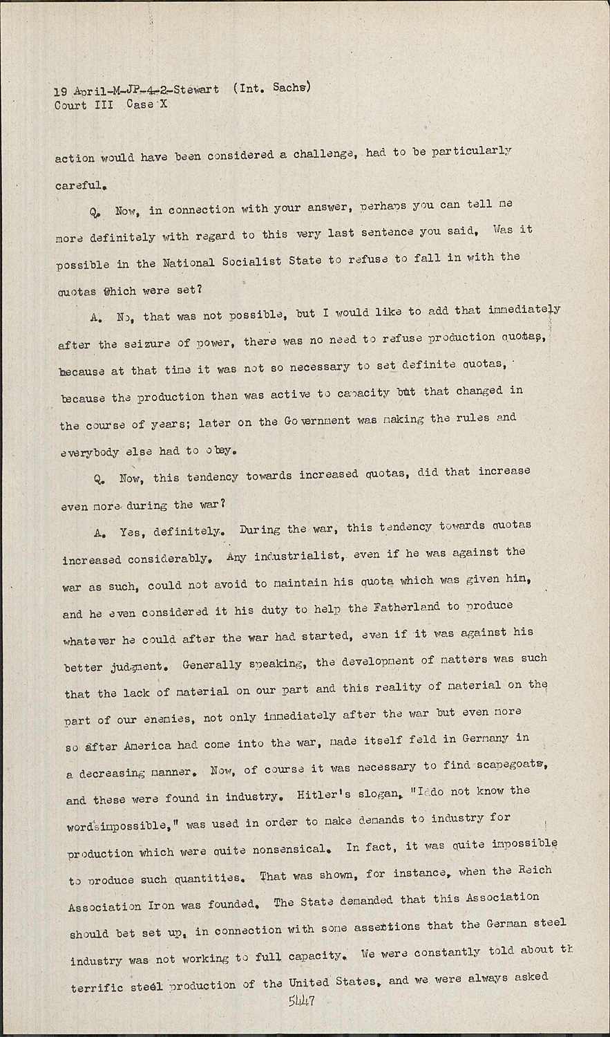 A.Yes, definitely. During the war, this tendency towards quotas increased considerably. Any industrialist, even if he was against the war as such, could not avoid to maintain his quota which was given him, and he even considered it his duty to help the Fatherland to produce whatever he could after the war had started, even if it was against his better judgment. Generally speaking, the development of matters was such that the lack of material on our part and this reality of material on the part of our enemies, not only immediately after the war but even more so after America had come into the war, made itself feld in Germany in a decreasing manner. Now, of course it was necessary to find scapegoats, and these were found in industry. Hitler's slogan, "I do not know the word impossible," was used in order to make demands to industry for production which were quite nonsensical. In fact, it was quite Impossible to produce such quantities. That was shown, for instance, when the Reich Association Iron was founded. The State demanded that this Association should bet set up, in connection with some assertions that the German steel industry was not working to full capacity. We were constantly told about the terrific steel production of the United States, and we were always asked why the Germans could not reach similar figures.