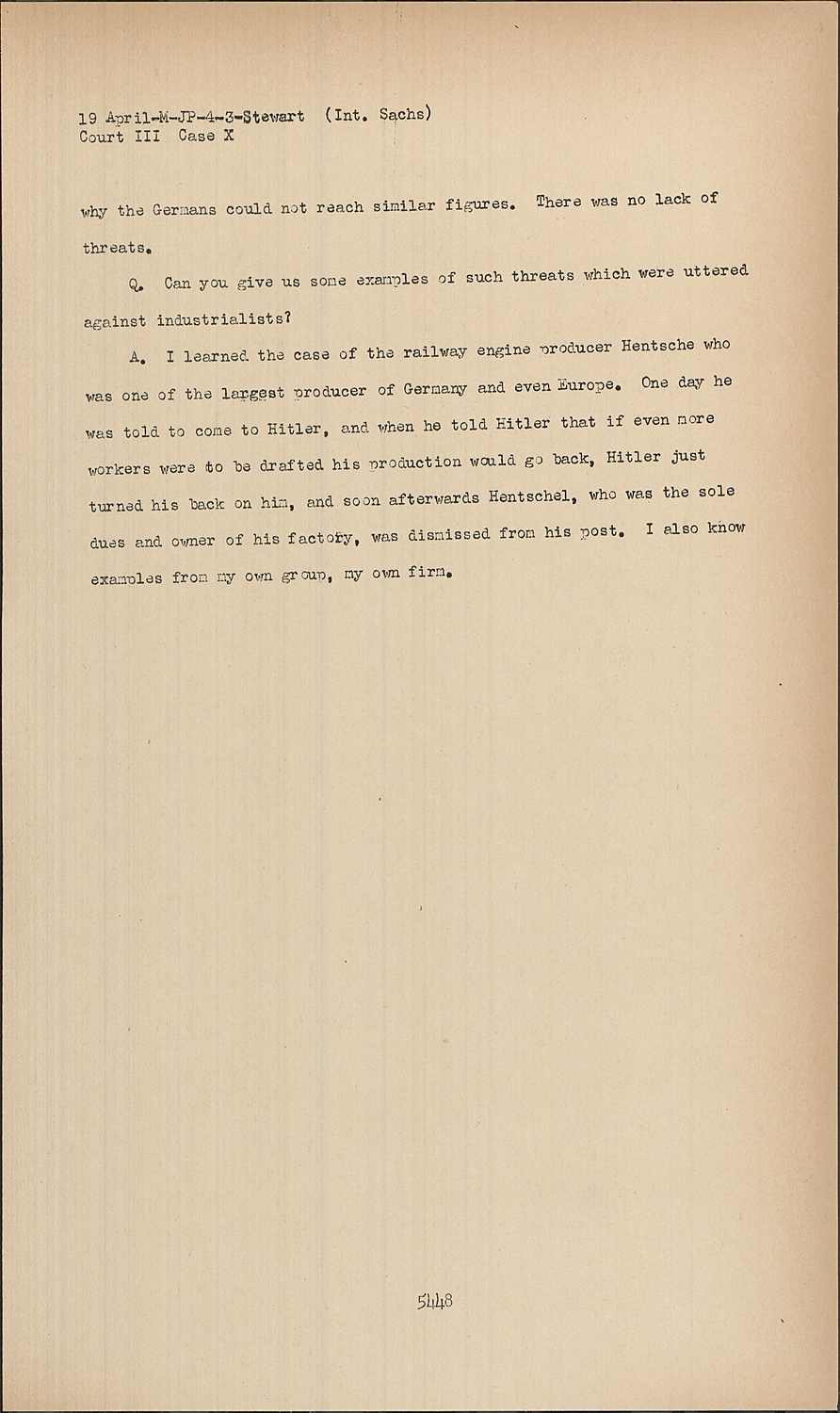A.I learned the case of the railway engine producer Hentsche who was one of the largest producer of Germany and even Europe. One day he was told to come to Hitler, and when he told Hitler that if even more workers were to be drafted his production would go back, Hitler just turned his back on him, and soon afterwards Hentschel, who was the sole dues and owner of his factory, was dismissed from his post. I also know examples from my own group, my own firm.