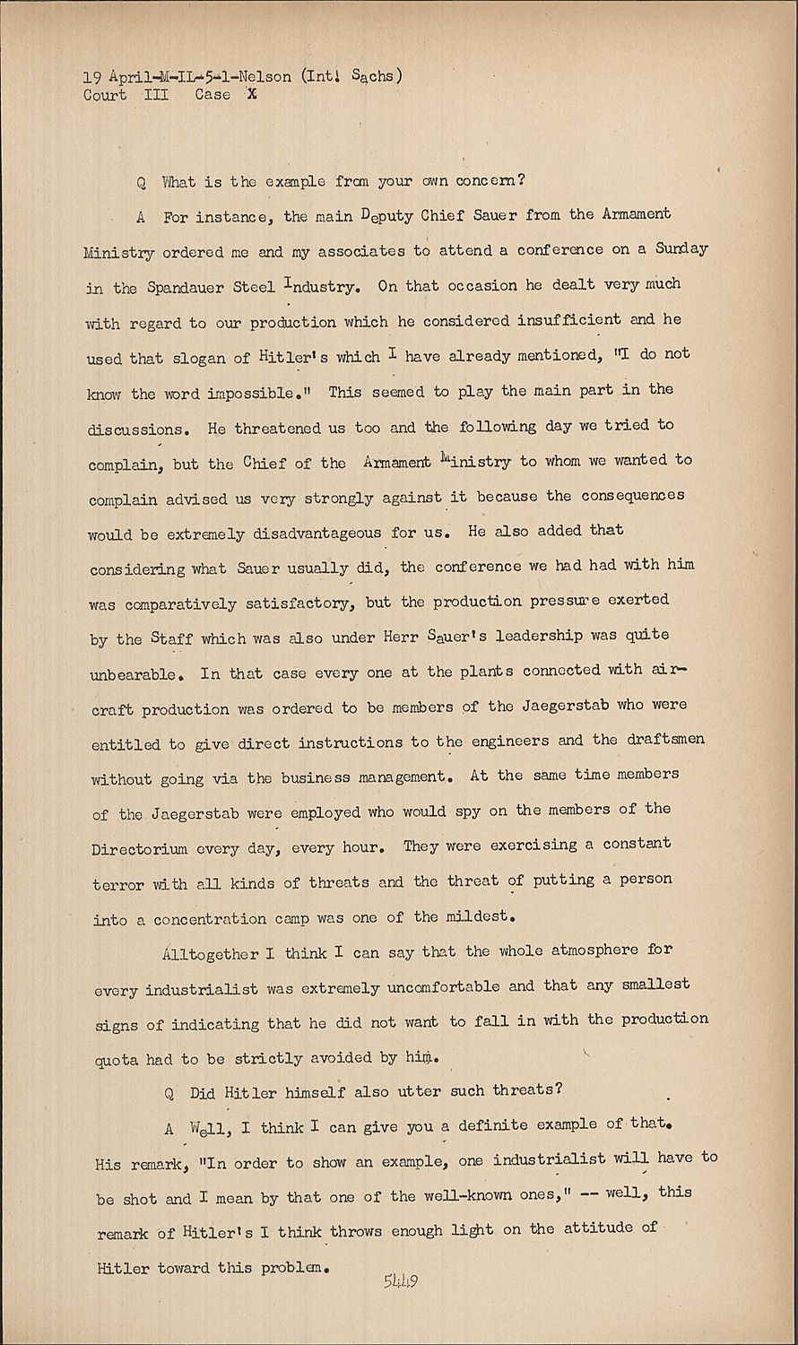 AFor instance, the main Deputy Chief Sauer from the Armament Ministry ordered me and my associates to attend a conference on a Sunday in the Spandauer Steel Industry. On that occasion he dealt very much with regard to our production which he considered insufficient and he used that slogan of Hitler's which I have already mentioned, "I do not know the word impossible." This seemed to play the main part in the discussions. He threatened us too and the following day we tried to complain, but the Chief of the Armament Ministry to whom we wanted to complain advised us very strongly against it because the consequences would be extremely disadvantageous for us. He also added that considering what Sauer usually did, the conference we had had with him was comparatively satisfactory, but the production pressure exerted by the Staff which was also under Herr Sauer's leadership was quite unbearable. In that case every one at the plants connected with aircraft production was ordered to be members of the Jaegerstab who were entitled to give direct instructions to the engineers and the draftsmen without going via the business management. At the same time members of the Jaegerstab were employed who would spy on the members of the Directorium every day, every hour. They were exercising a constant terror with all kinds of threats and the threat of putting a person into a concentration camp was one of the mildest.