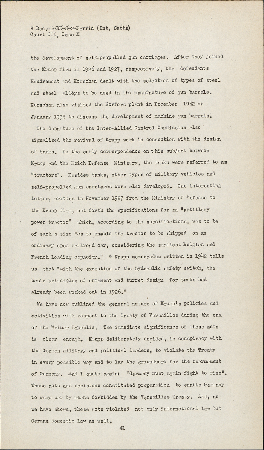 We have now outlined the general nature of Krupp's policies and activities with respect to the Treaty of Versailles during the era of the Weimar Republic. The immediate significance of these acts is clear enough. Krupp deliberately decided, in conspiracy with the German military and political leaders, to violate the Treaty in every possible way and to lay the groundwork for the rearmament of Germany. And I quote again: "Germany must again fight to rise". These acts and decisions constituted preparation to enable Germany to wage war by means forbidden by the Versailles Treaty. And, as we have shown, these acts violated not only international law but German domestic law as well.
