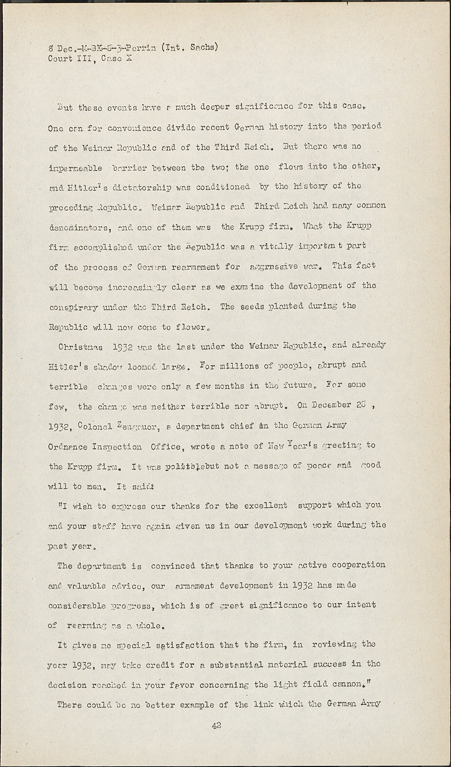 But these events have a much deeper significance for this case. One can for convenience divide recent German history into the period of the Weimar Republic and of the Third Reich. But there was no impermeable barrier between the two; the one flows into the other, and Hitler's dictatorship was conditioned by the history of the preceding Republic. Weimar Republic and Third Reich had many common denominators, and one of them was the Krupp firm. What the Krupp firm accomplished under the Republic was a vitally important part of the process of German rearmament for aggressive war. This fact will become increasingly clear as we examine the development of the conspiracy under the Third Reich. The seeds planted during the Republic will now come to flower.