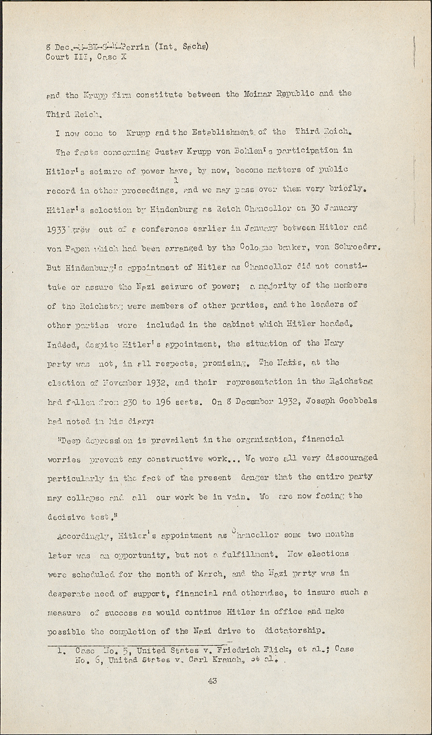 The facts concerning Gustav Krupp von Bohlen's participation in Hitler's seizure of power have, by now, become matters of public record in other proceedings, and we may pass over them very briefly. Hitler's selection by Hindenburg as Reich Chancellor on 30 January 1933 grew out of a conference earlier in January between Hitler and von Papen which had been arranged by the Cologne banker, von Schroeder. But Hindenburg's appointment of Hitler as Chancellor did not constitute or assure the Nazi seizure of power; a majority of the members of the Reichstag were members of other parties, and the leaders of other parties were included in the cabinet which Hitler headed. Indeed, despite Hitler's appointment, the situation of the Nary party was not, in all respects, promising. The Nazis, at the election of November 1932, and their representation in the Reichstag had fallen from 230 to 196 seats. On 8 December 1932, Joseph Goebbels had noted, in his diary: