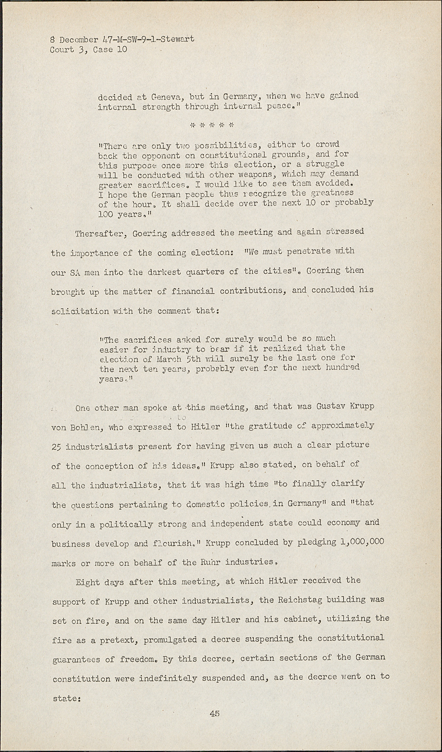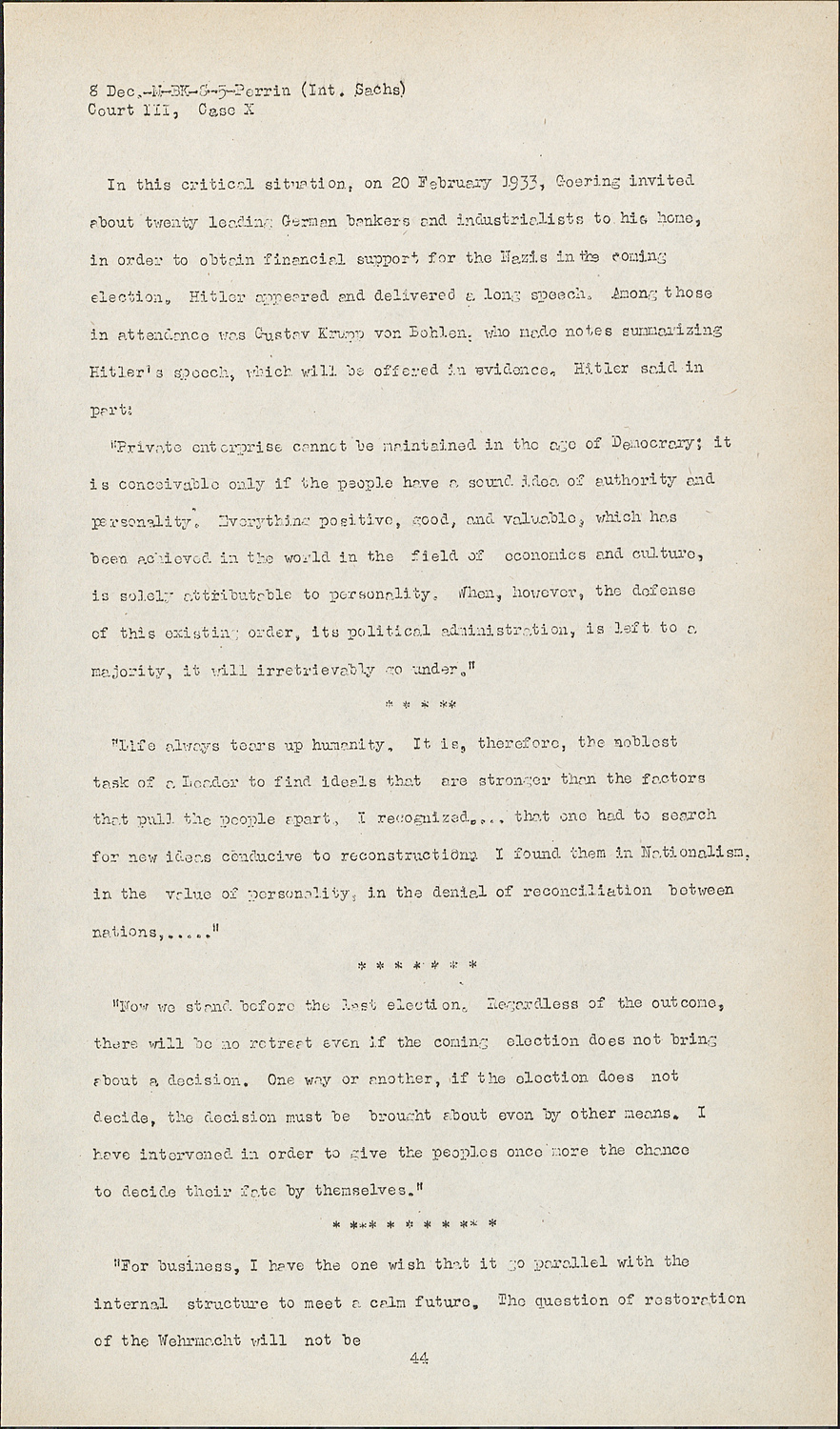 In this critical situation, on 20 February 1933, Goering invited about twenty leading German bankers and industrialists to his home, in order to obtain financial support for the Nazis in the coming election. Hitler appeared and delivered a long speech. Among those in attendance was Gustav Krupp von Bohlen, who made notes summarizing Hitler's speech, which will be offered in evidence. Hitler said in part:
