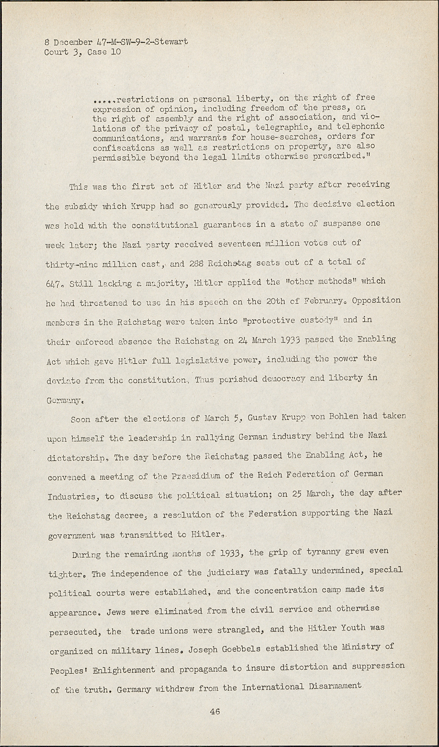 This was the first act of Hitler and the Nazi party after receiving the subsidy which Krupp had so generously provided. The decisive election was held with the constitutional guarantees in a state of suspense one week later; the Nazi party received seventeen million votes out of thirty-nine million cast, and 288 Reichstag seats out of a total of 647. Still lacking a majority, Hitler applied the "other methods" which he had threatened to use in his speech on the 20th of February. Opposition members in the Reichstag were taken into "protective custody" and in their enforced absence the Reichstag on 24 March 1933 passed the Enabling Act which gave Hitler full legislative power, including the power the deviate from the constitution. Thus perished democracy and liberty in Germany.