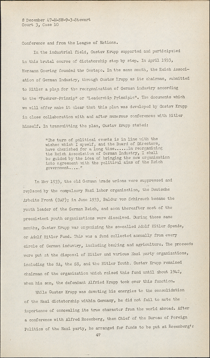 In the industrial field, Gustav Krupp supported and participated in this brutal course of dictatorship step by step. In April 1933, Hermann Goering founded the Gestapo. In the same month, the Reich Association of German Industry, through Gustav Krupp as its chairman, submitted to Hitler a plan for the reorganization of German industry according to the "Fuehrer-Prinzip" or "Leadership Principle". The documents which we will offer make it clear that this plan was developed by Gustav Krupp in close collaboration with and after numerous conferences with Hitler himself. In transmitting the plan, Gustav Krupp stated: