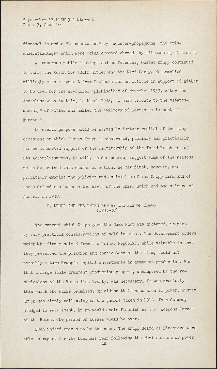 No useful purpose would be served by further recital of the many occasions on which Gustav Krupp demonstrated, publicly and practically, his wholehearted support of the dictatorship of the Third Reich and of its accomplishments. We will, in due course, suggest some of the reasons which determined this course of action. We may first, however, more profitably examine the policies and activities of the Krupp firm and of these defendants between the birth of the Third Reich and the seizure of Austria in 1938.