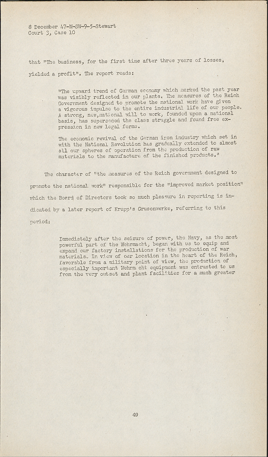The character of "the measures of the Reich government designed to promote the national work" responsible for the "improved market position" which the Board of Directors took so much pleasure in reporting is indicated by a later report of Krupp's Grusonwerke, referring to this period: