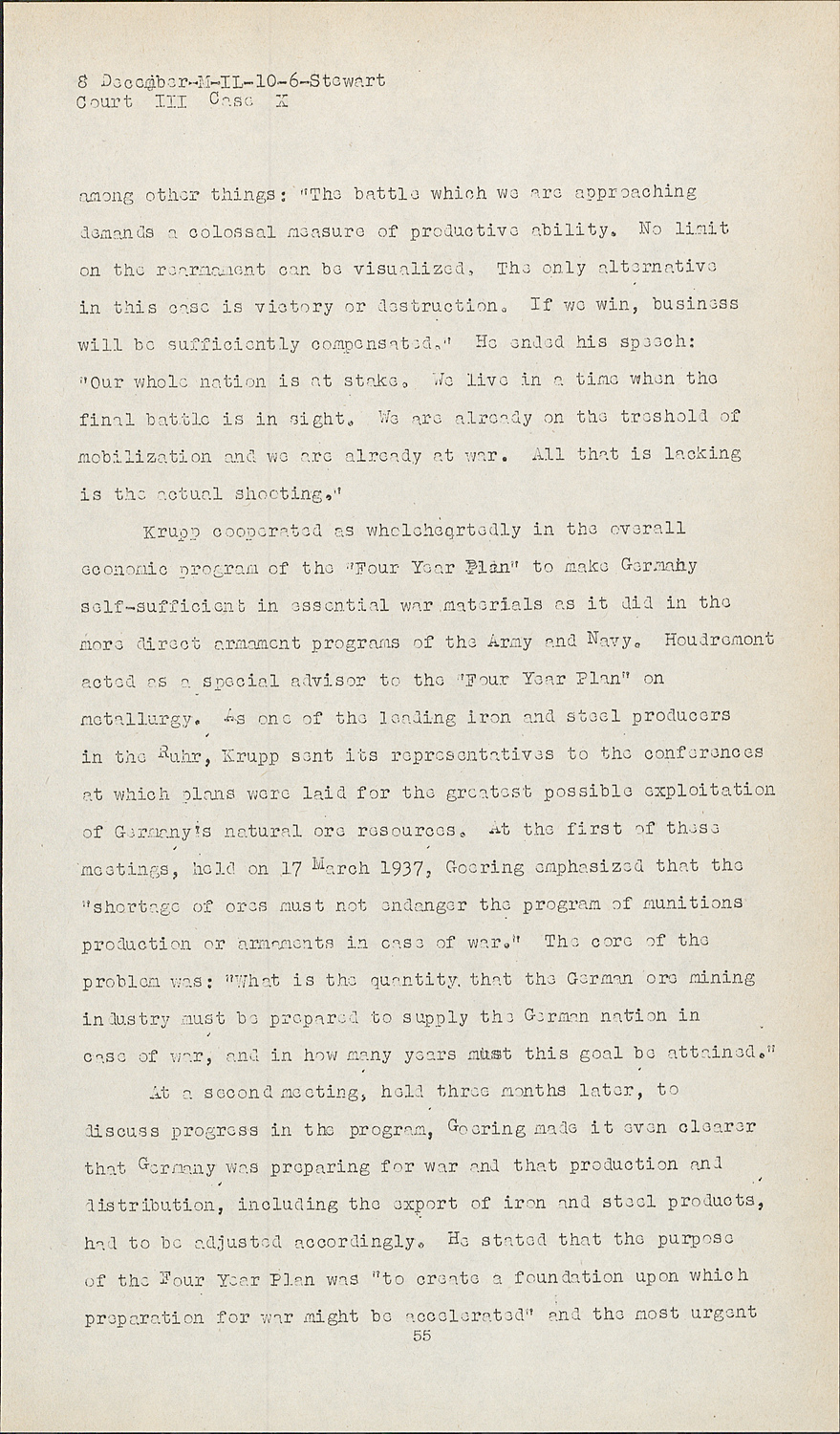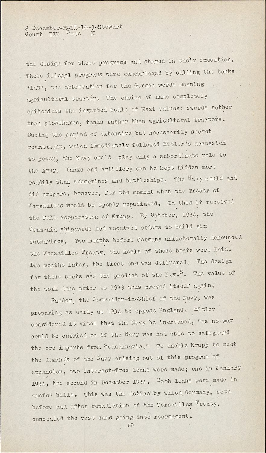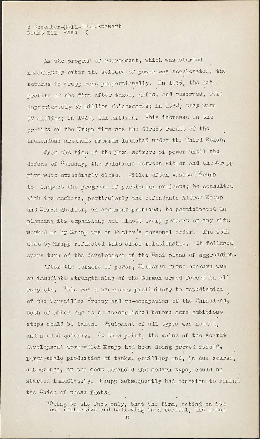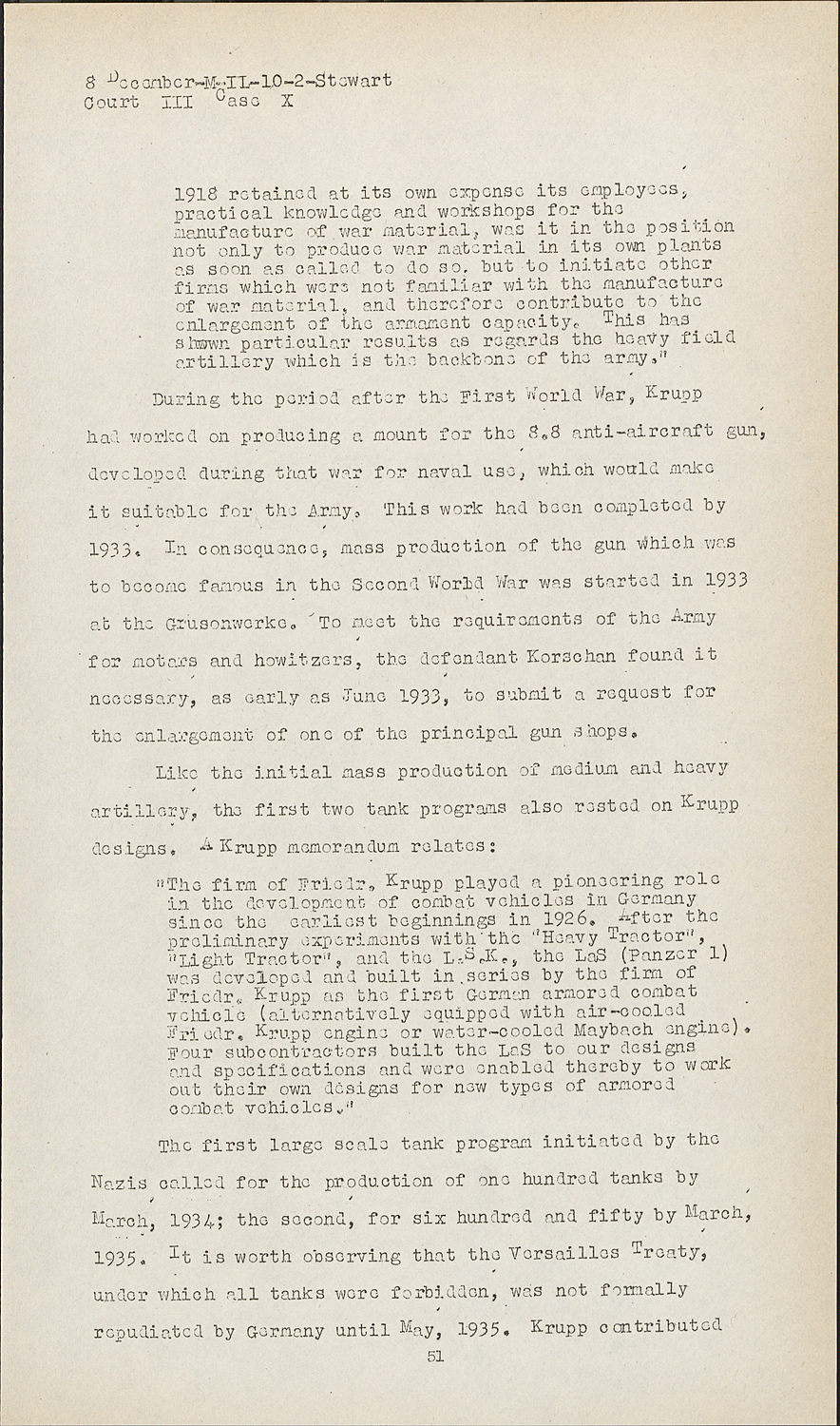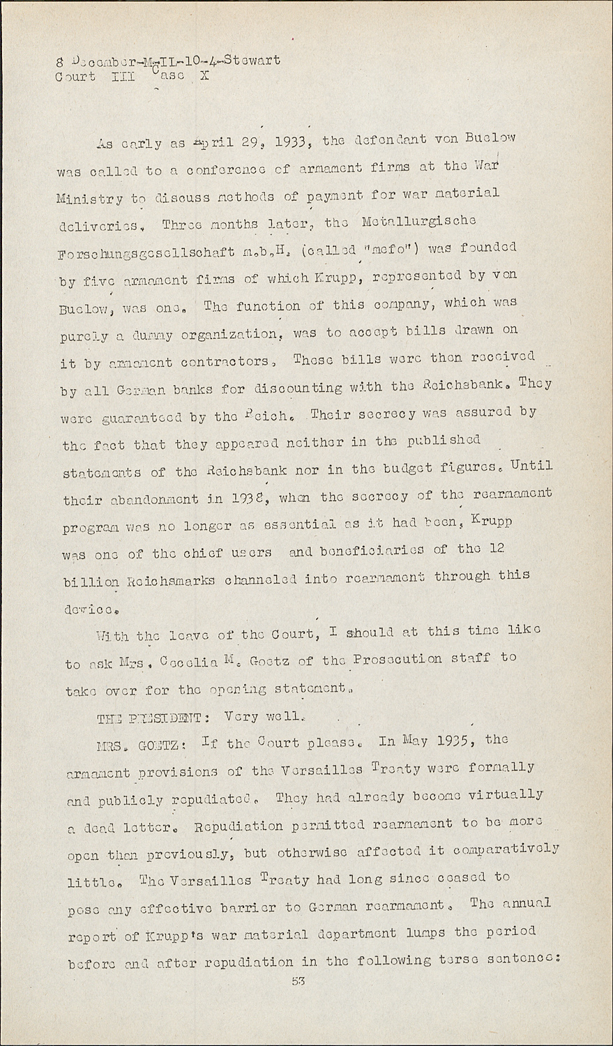 MRS. GOETZ:If the Court please. In May 1935, the armament provisions of the Versailles Treaty were formally and publicly repudiated. They had already become virtually a dead letter. Repudiation permitted rearmament to be more open than previously, but otherwise affected it comparatively little. The Versailles Treaty had long since ceased to pose any effective barrier to German rearmament. The annual report of Krupp's war material department lumps the period before and after repudiation in the following terse sentence: