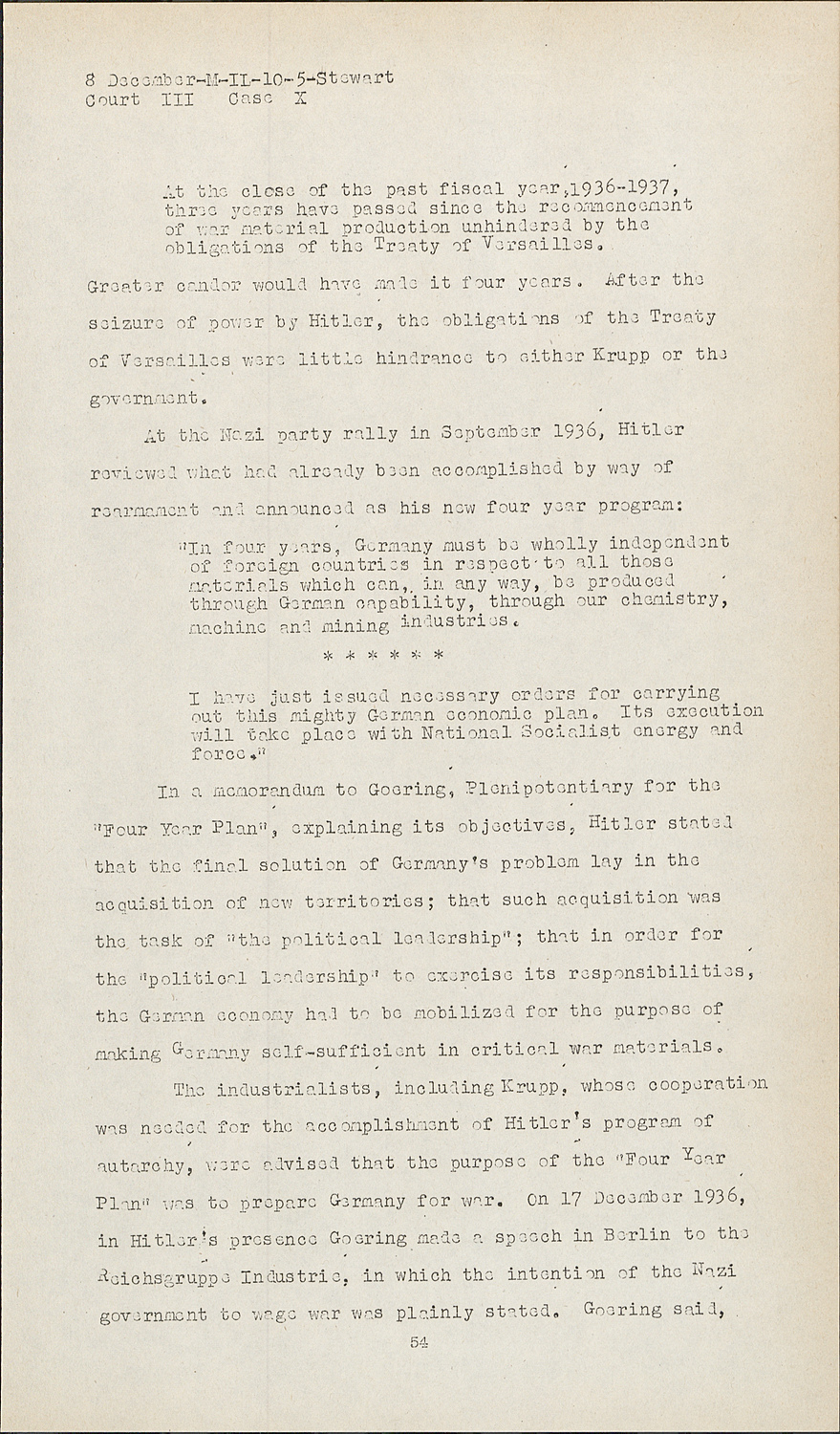 The industrialists, including Krupp, whose cooperation was needed for the accomplishment of Hitler's program of autarchy, were advised that the purpose of the "Four Year Plan" was to prepare Germany for war. On 17 December 1936, in Hitler's presence Goering made a speech in Berlin to the Reichsgruppe Industrie, in which the intention of the Nazi government to wage war was plainly stated. Goering said, among other things:
