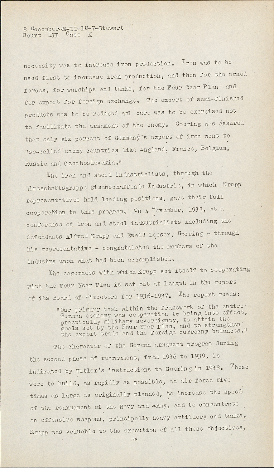 The iron and steel industrialists, through the Wirtschaftsgruppe Eisensehaffende Industrie, in which Krupp representatives held leading positions, gave their full cooperation to this program. On 4 November, 1938, at a conference of iron and steel indsutrialists including the defendants Alfred Krupp and Ewald Loeser, Goering - through his representative - congratulated the members of the industry upon what had been accomplished.