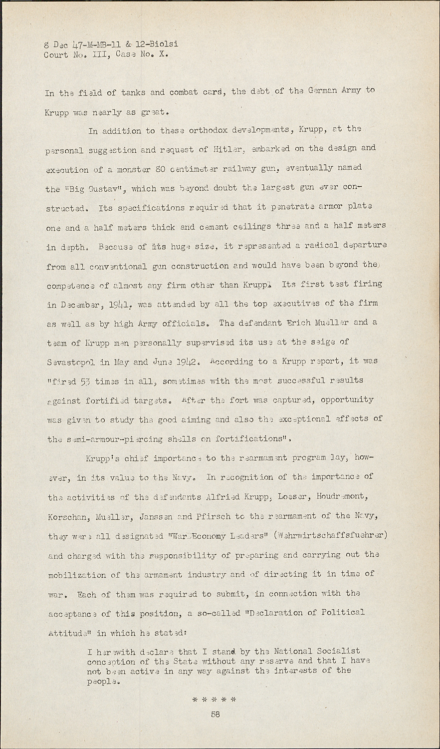 In addition to these orthodox developments, Krupp, at the personal suggestion and request of Hitler, embarked on the design and execution of a monster 80 centimeter railway gun, eventually named the "Big Gustav", which was beyond doubt the largest gun ever constructed. Its specifications required that it penetrate armor plate one and a half meters thick and cement ceilings three and a half meters in depth. Because of its huge size, it represented a radical departure from all conventional gun construction and would have bean beyond the competence of almost any firm other than Krupp. Its first test firing in December, 1941, was attended by all the top executives of the firm as well as by high Army officials. The defendant Erich Mueller and a team of Krupp men personally supervised its use at the seige of Sevastopol in May and June 1942. According to a Krupp report, it was "fired 53 times in all, sometimes with the most successful results against fortified targets. After the fort was captured, opportunity was given to study the good aiming and also the exceptional effects of the semi-armour-piercing shells on fortifications".