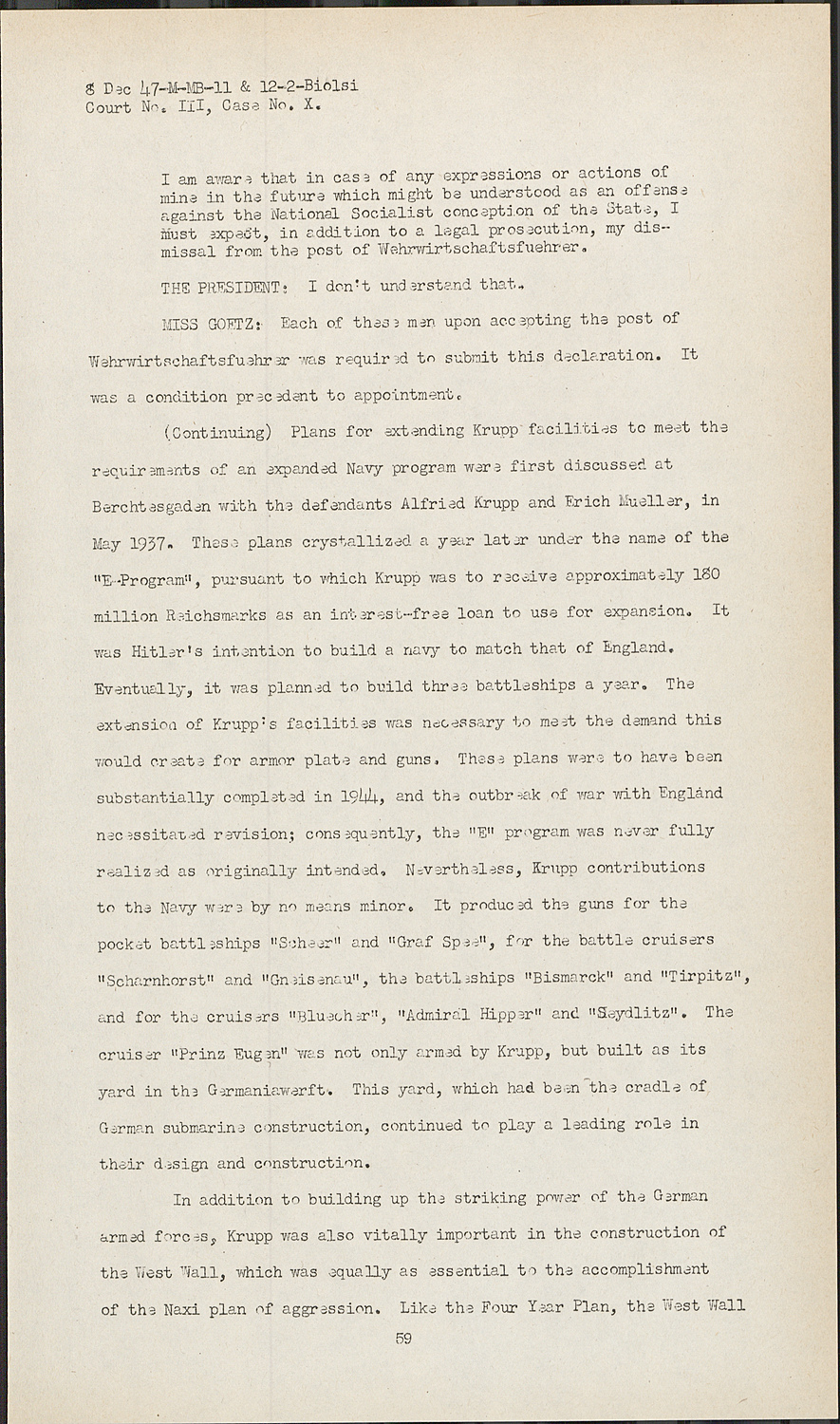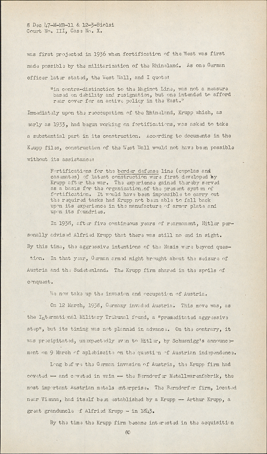 In addition to building up the striking power of the German armed forces, Krupp was also vitally important in the construction of the West Wall, which was equally as essential to the accomplishment of the Naxi plan of aggression. Like the Four Year Plan, the West Wall Court No. III, Case No. X.was first projected in 1936 when fortification of the West was first made possible by the militarization of the Rhineland.