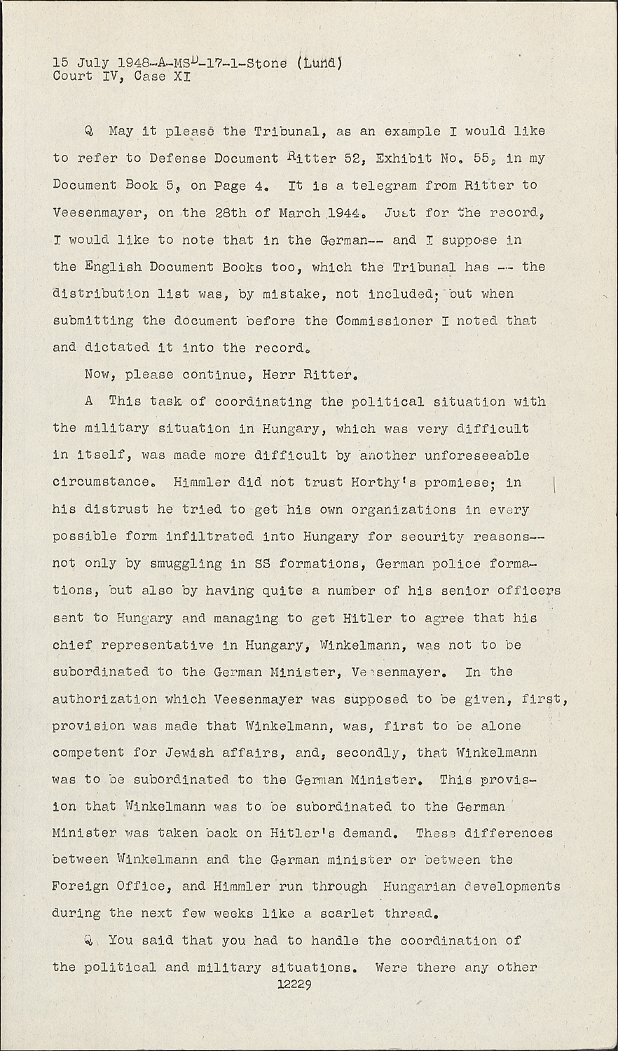 QMay it please the Tribunal, as an example I would like to refer to Defense Document Ritter 52, Exhibit No. 55, in my Document Book 5, on Page 4. It is a telegram from Ritter to Veesenmayer, on the 28th of March 1944. Just for the record, I would like to note that in the German-- and I suppose in the English Document Books too, which the Tribunal has -- the distribution list was, by mistake, not included; but when submitting the document before the Commissioner I noted that and dictated it into the record.