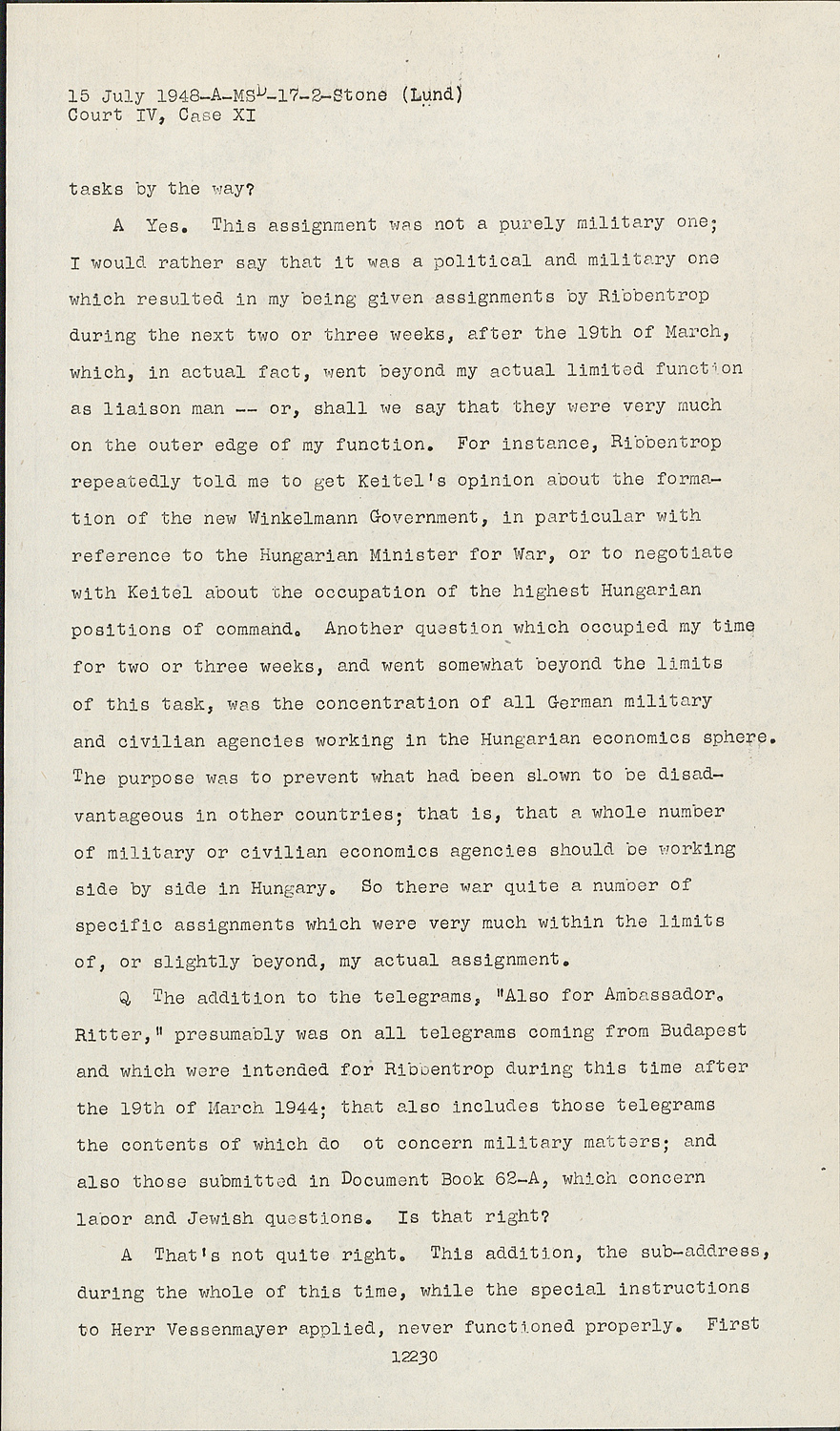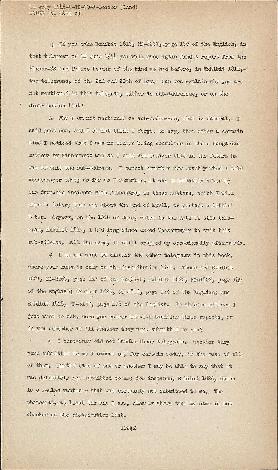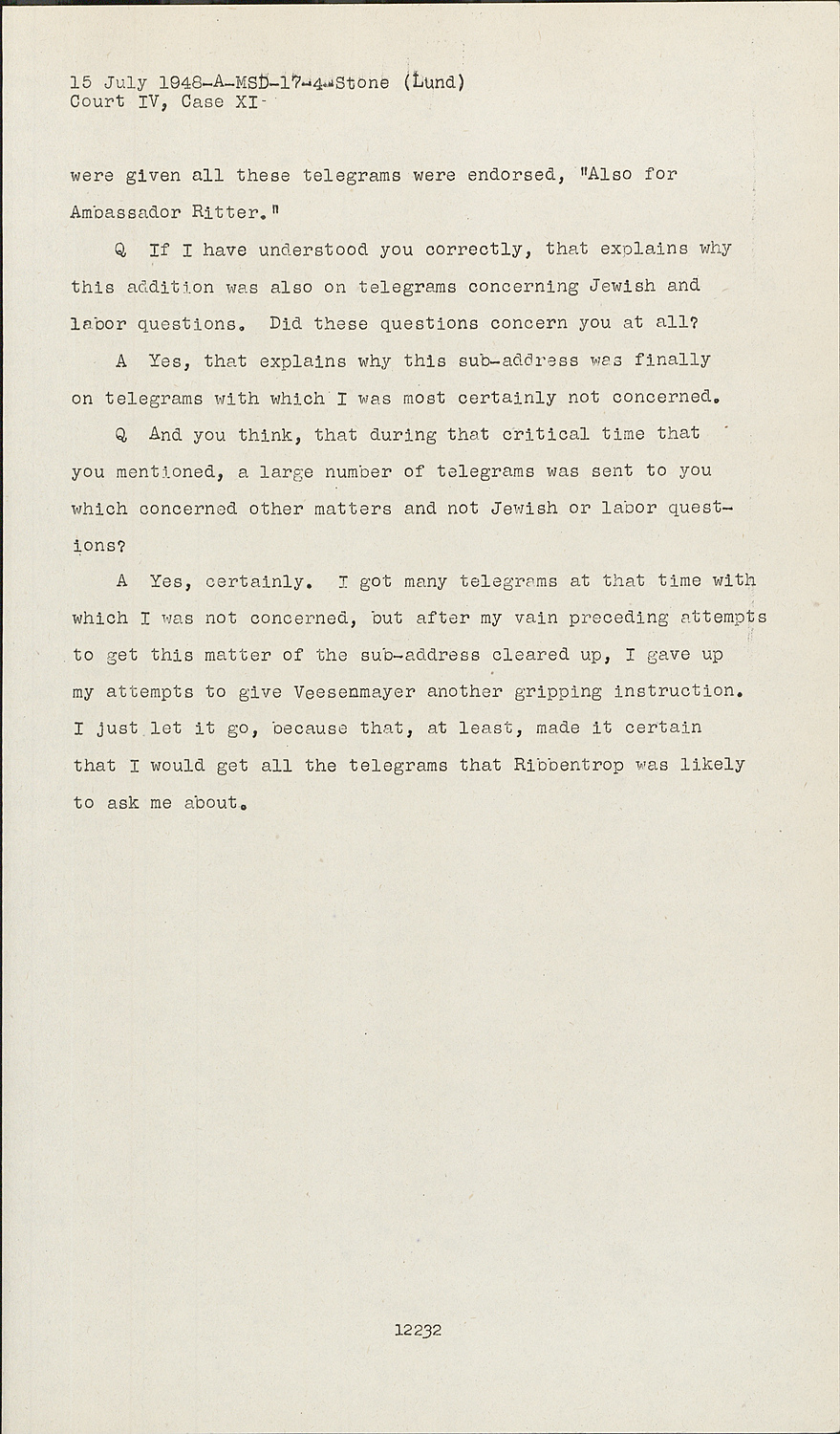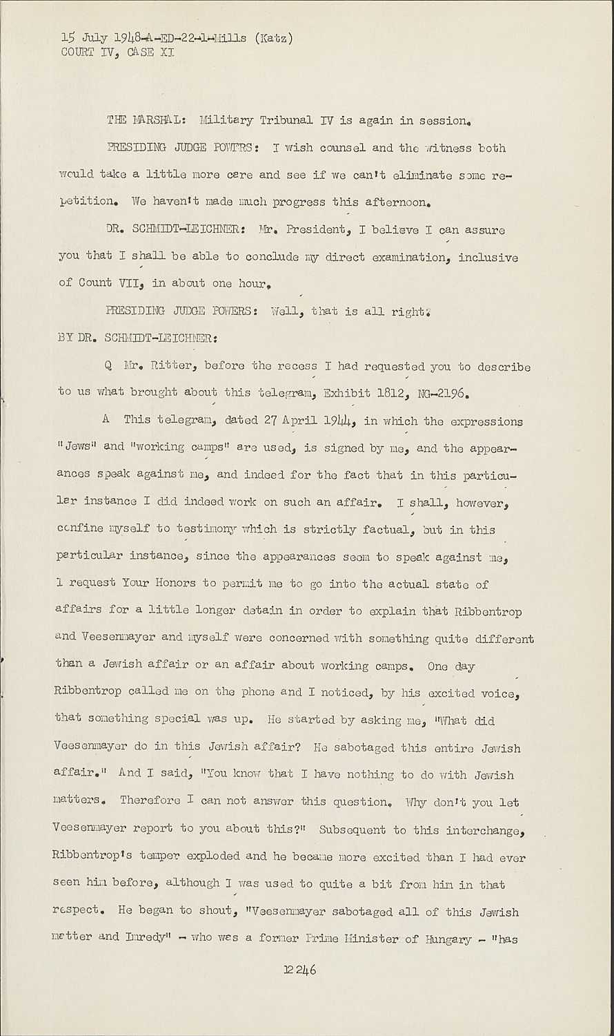 AThis telegram, dated 27 April 1944, in which the expressions "Jews" and "working camps" are used, is signed by me, and the appearances speak against me, and indeed for the fact that in this particular instance I did indeed work on such an affair. I shall, however, confine myself to testimony which is strictly factual, but in this particular instance, since the appearances seem to speak against me, I request Your Honors to permit me to go into the actual state of affairs for a little longer detain in order to explain that Ribbentrop and Veesenmayer and myself were concerned with something quite different than a Jewish affair or an affair about working camps. One day Ribbentrop called me on the phone and I noticed, by his excited voice, that something special was up. He started by asking me, "What did Veesenmayer do in this Jewish affair? He sabotaged this entire Jewish affair." And I said, "You know that I have nothing to do with Jewish matters. Therefore I can not answer this question. Why don't you let Veesenmayer report to you about this?" Subsequent to this interchange, Ribbentrop's temper exploded and he became more excited than I had ever seen him before, although I was used to quite a bit from him in that respect. He began to shout, "Veesenmayer sabotaged all of this Jewish matter and Imredy" - who was a former Prime Minister of Hungary - "has bribed him with Jewish money."