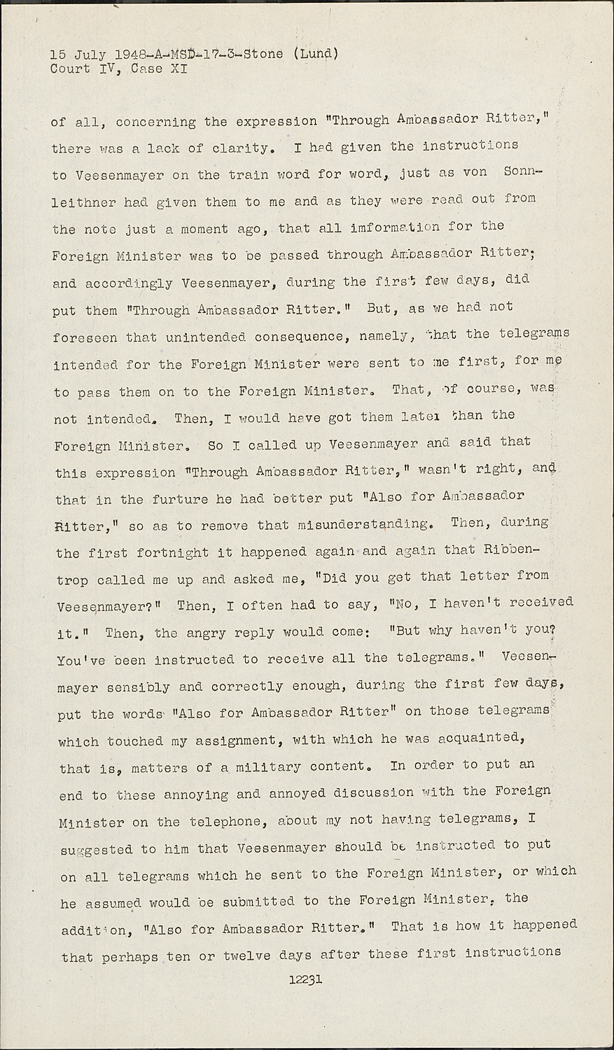 I had given the instructions to Veesenmayer on the train word for word, just as von Sonnleithner had given them to me and as they were read out from the note just a moment ago, that all information for the Foreign Minister was to be passed through Ambassador Ritter; and accordingly Veesenmayer, during the first few days, did put them "Through Ambassador Ritter." But, as we had not foreseen that unintended consequence, namely, that the telegrams intended for the Foreign Minister were sent to me first, for me to pass them on to the Foreign Minister. That, of course, was not intended. Then, I would have got them later than the Foreign Minister. So I called up Veesenmayer and said that this expression "Through Ambassador Ritter," wasn't right, and that in the furture he had better put "Also for Ambassador Ritter," so as to remove that misunderstanding. Then, during the first fortnight it happened again and again that Ribbentrop called me up and asked me, "Did you get that letter from Veesenmayer?" Then, I often had to say, "No, I haven't received it." Then, the angry reply would come: "But why haven't you? You've been instructed to receive all the telegrams." Veesenmayer sensibly and correctly enough, during the first few days, put the words "Also for Ambassador Ritter" on those telegrams which touched my assignment, with which he was acquainted, that is, matters of a military content. In order to put an end to these annoying and annoyed discussion with the Foreign Minister on the telephone, about my not having telegrams, I suggested to him that Veesenmayer should be instructed to put on all telegrams which he sent to the Foreign Minister, or which he assumed would be submitted to the Foreign Minister, the addition, "Also for Ambassador Ritter." That is how it happened that perhaps ten or twelve days after these first instructions were given all these telegrams were endorsed, "Also for Ambassador Ritter."