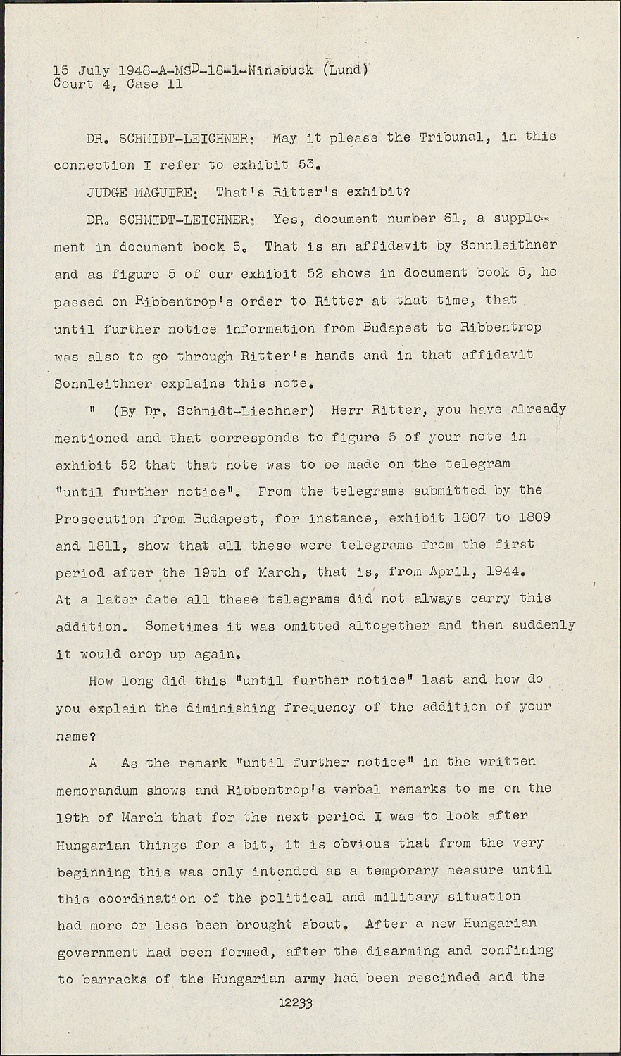 DR.SCHMIDT-LEICHNER; Yes, document number 61, a supplement in document book 5. That is an affidavit by Sonnleithner and as figure 5 of our exhibit 52 shows in document book 5, he passed on Ribbentrop's order to Ritter at that time, that until further notice information from Budapest to Ribbentrop was also to go through Ritter's hands and in that affidavit Sonnleithner explains this note.