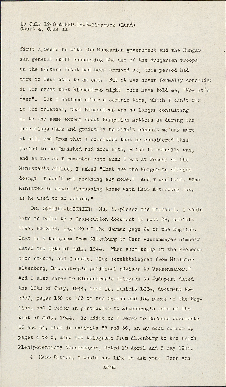 DR.SCHMIDT-LEICHNER: May it please the Tribunal, I would like to refer to a Prosecution document in book 38, exhibit 1197, NG-2174, page 29 of the German page 29 of the English. That is a telegram from Altenburg to Herr Veesenmayer himself dated the 12th of July, 1944. When submitting it the Prosecution stated, and I quote, "Top seretttelegram from Minister Altenburg, Ribbentrop's political advisor to Veesenmayer." And I also refer to Ribbentrop's telegram to Budapest dated the 16th of July, 1944, that is, exhibit 1824, document NG2739, pages 158 to 163 of the German and 354 pages of the English, and I refer in particular to Altenbrug's note of the 21st of July, 1944. In addition I refer to Defense documents 53 and 54, that is exhibits 55 and 56, in my book number 5, pages 4 to 5, also two telegrams from Altenburg to the Reich Plenipotentiary Veesenmayer, dated 19 April and 5 May 1944.