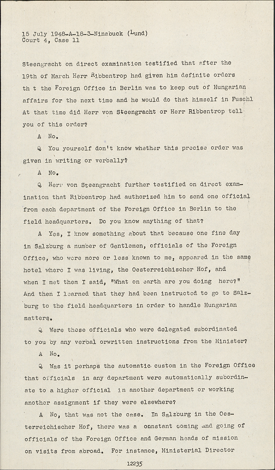 QHerr Ritter, I would now like to ask you; Herr von Steengracht on direct examination testified that after the 19th of March Herr Ribbentrop had given him definite orders that the Foreign Office in Berlin was to keep out of Hungarian affairs for the next time and he would do that himself in Fuschl At that time did Herr von Steengracht or Herr Ribbentrop tell you of this order?
