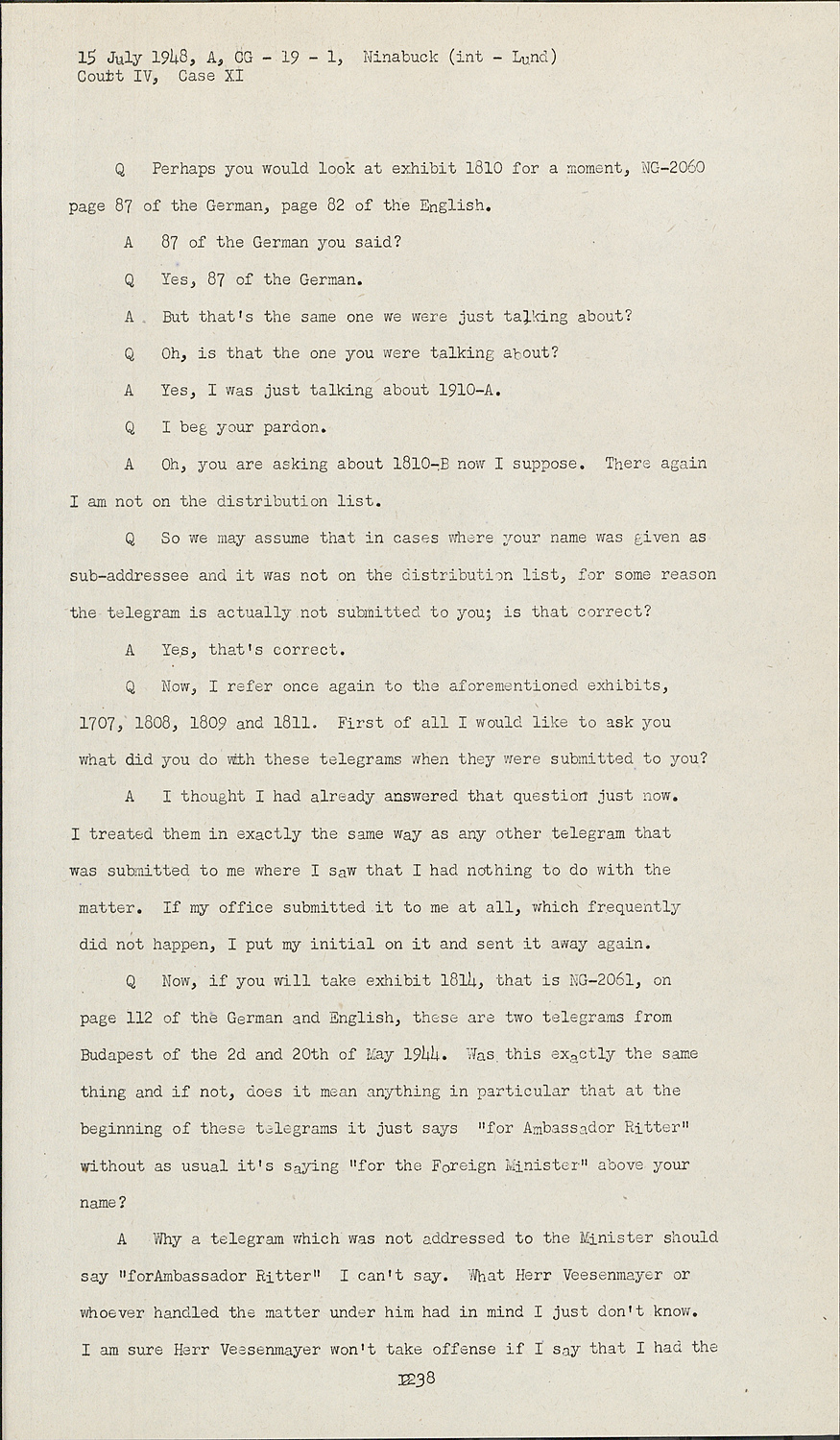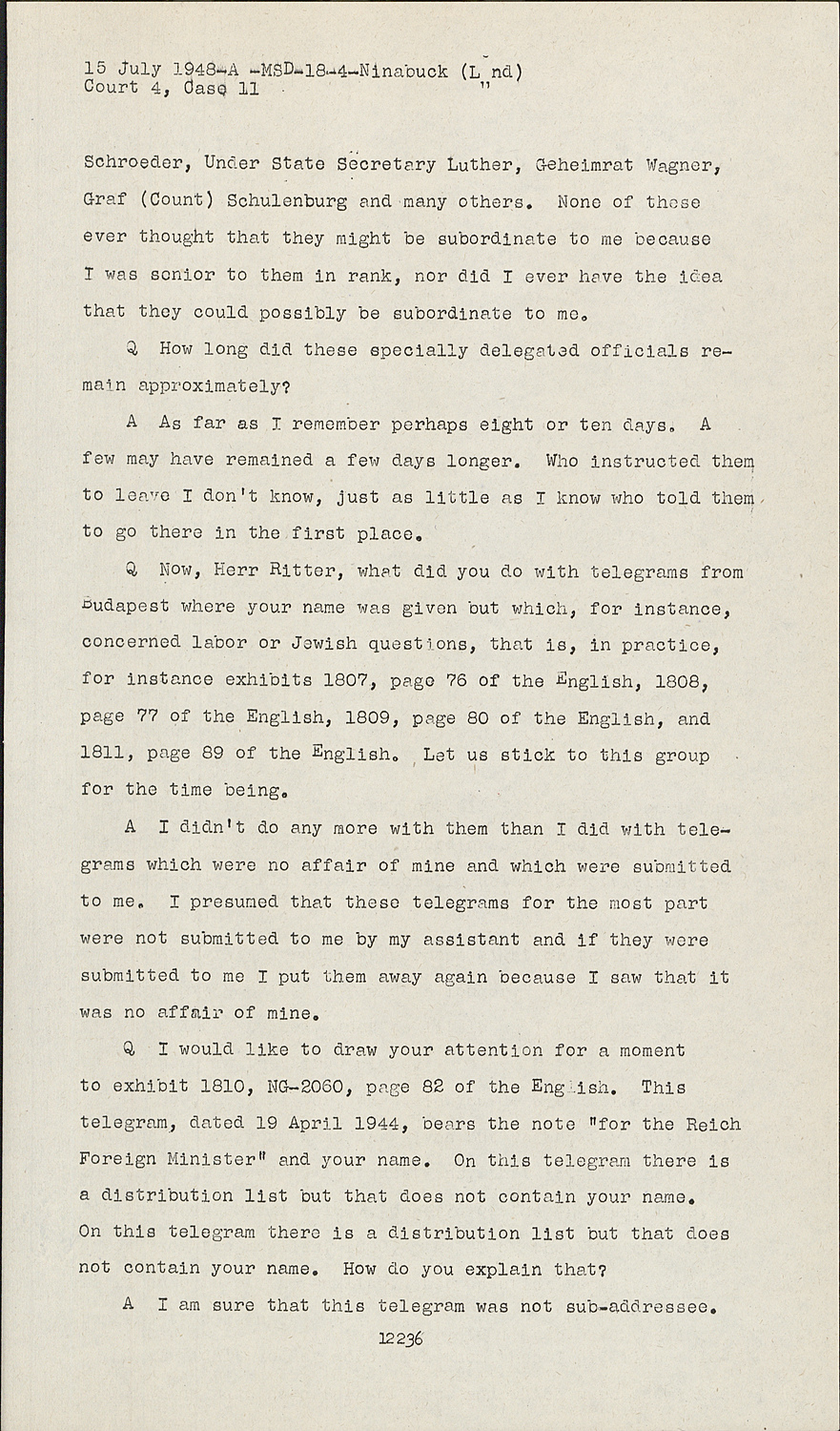 QNow, Herr Hitter, what did you do with telegrams from Budapest where your name was given but which, for instance, concerned labor or Jewish questions, that is, in practice, for instance exhibits 1807, page 76 of the English, 1808, page 77 of the English, 1809, page 80 of the English, and 1811, page 89 of the English. Let us stick to this group for the time being.