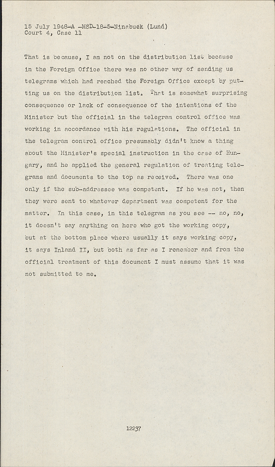 That is because, I am not on the distribution list because in the Foreign Office there was no other way of sending us telegrams which had reached the Foreign Office except by putting us on the distribution list. That is somewhat surprising consequence or lack of consequence of the intentions of the Minister but the official in the telegram control office was working in accordance with his regulations. The official in the telegram control office presumably didn't know a thing about the Minister's special instruction in the case of Hungary, and he applied the general regulation of treating telegrams and documents to the top as received. There was one only if the sub-addressee was competent. If he was not, then they were sent to whatever department was competent for the matter. In this case, in this telegram as you see -- no, no, it doesn't say anything on here who got the working copy, but at the bottom place where usually it says working copy, it says Inland II, but both as far as I remember and from the official treatment of this document I must assume that it was not submitted to me.