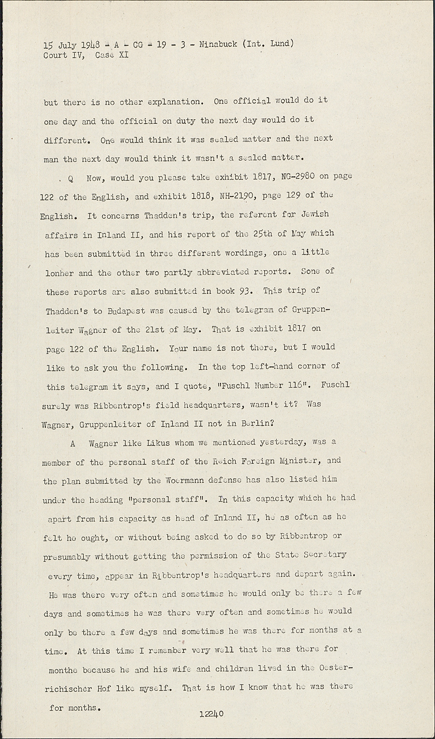 QNow, would you please take exhibit 1817, NG-2980 on page 122 of the English, and exhibit 1818, NH-2190, page 129 of the English. It concerns Thadden's trip, the referent for Jewish affairs in Inland II, and his report of the 25th of May which has been submitted in three different wordings, one a little lonher and the other two partly abbreviated reports.