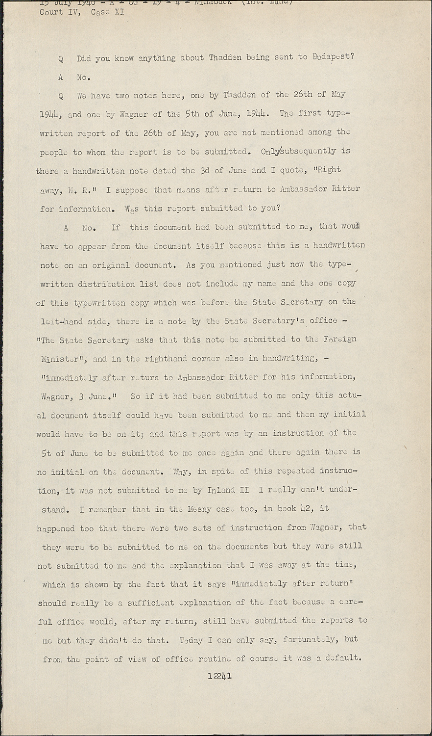 As you mentioned just now the type written distribution list does not include my name and the one copy of this typewritten copy which was before the State Secretary on the left-hand side, there is a note by the State Secretary's office "The State Secretary asks that this note be submitted to the Foreign Minister", and in the righthand corner also in handwriting, "immediately after return to Ambassador Ritter for his information, Wagner, 3 June."