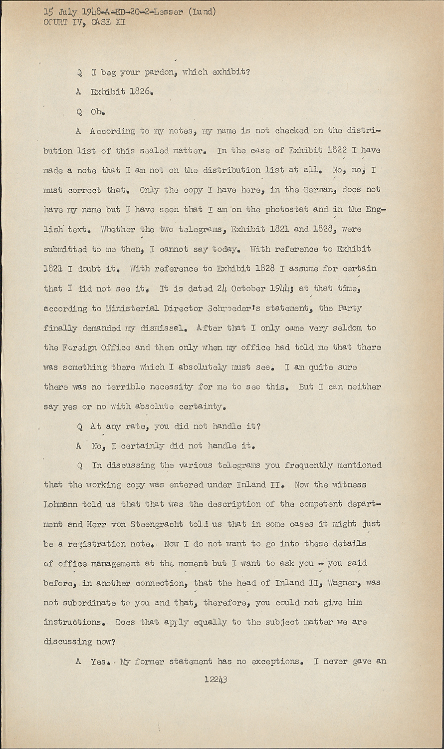 QIn discussing the various telegrams you frequently mentioned that the working copy was entered under Inland II. Now the witness Lohmann told us that that was the description of the competent department and Herr von Steengracht told us that in some cases it might just be a registration note. Now I do not want to go into these details of office management at the moment but I want to ask you - you said before, in another connection, that the head of Inland II, Wagner, was not subordinate to you and that, therefore, you could not give him instructions. Does that apply equally to the subject matter we are discussing now?