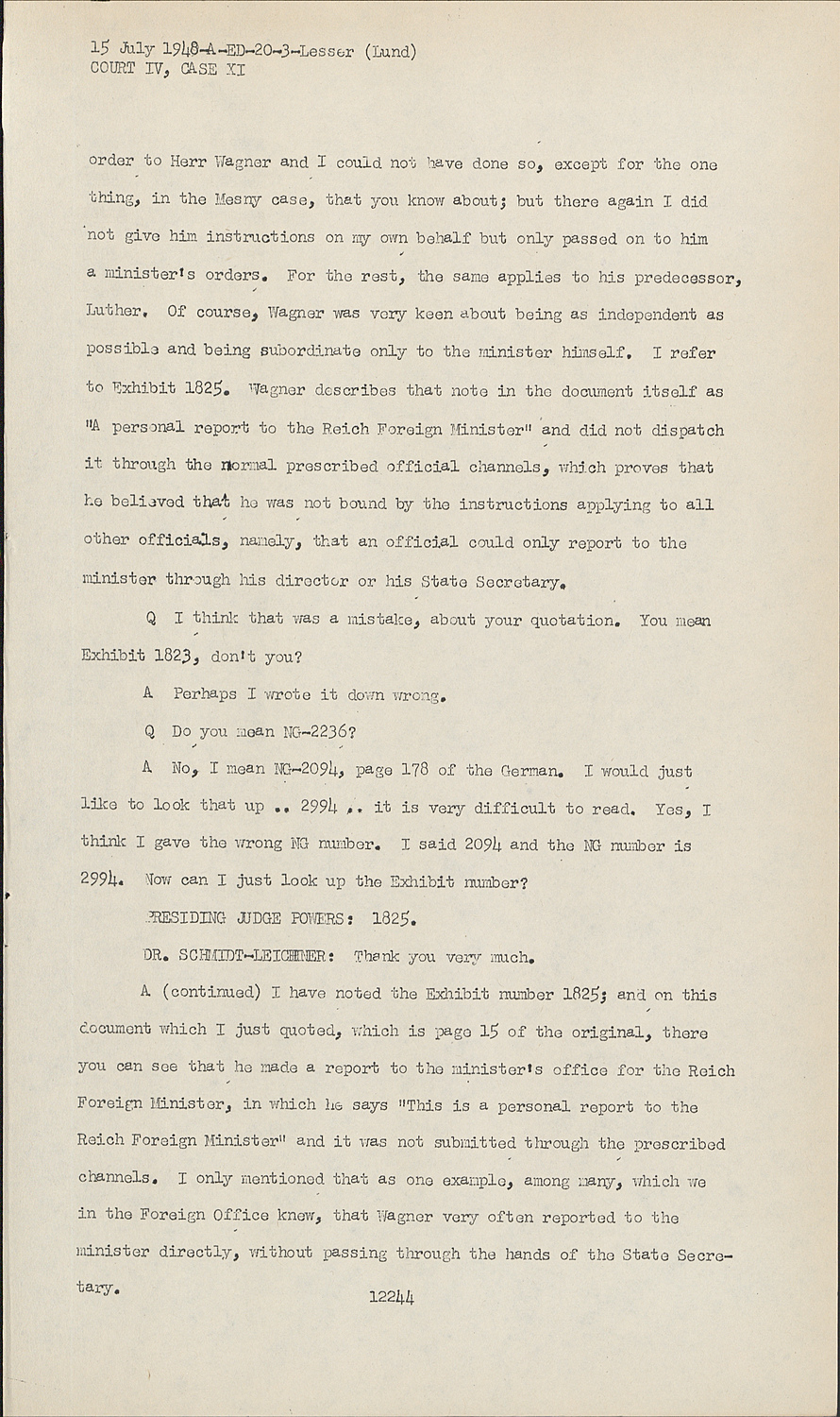 A (continued) I have noted the Exhibit number 1825; and on this document which I just quoted, which is page 15 of the original, there you can see that he made a report to the minister's office for the Reich Foreign Minister, in which he says "This is a personal report to the Reich Foreign Minister" and it was not submitted through the prescribed channels. I only mentioned that as one example, among many, which we in the Foreign Office know, that Wagner very often reported to the minister directly, without passing through the hands of the State Secretary.