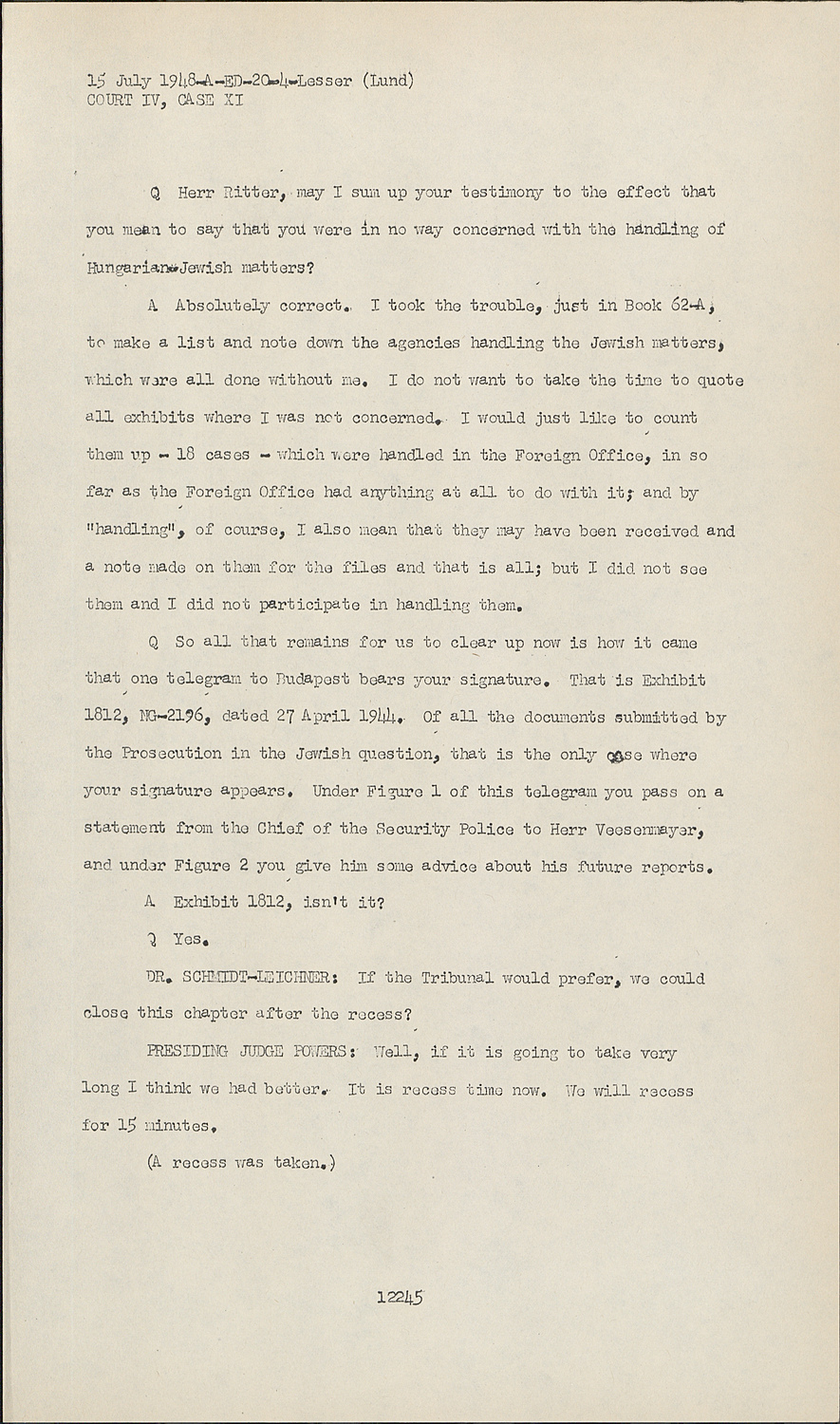 QHerr Ritter, may I sum up your testimony to the effect that you mean to say that you were in no way concerned with the handling of Hungarian-Jewish matters?