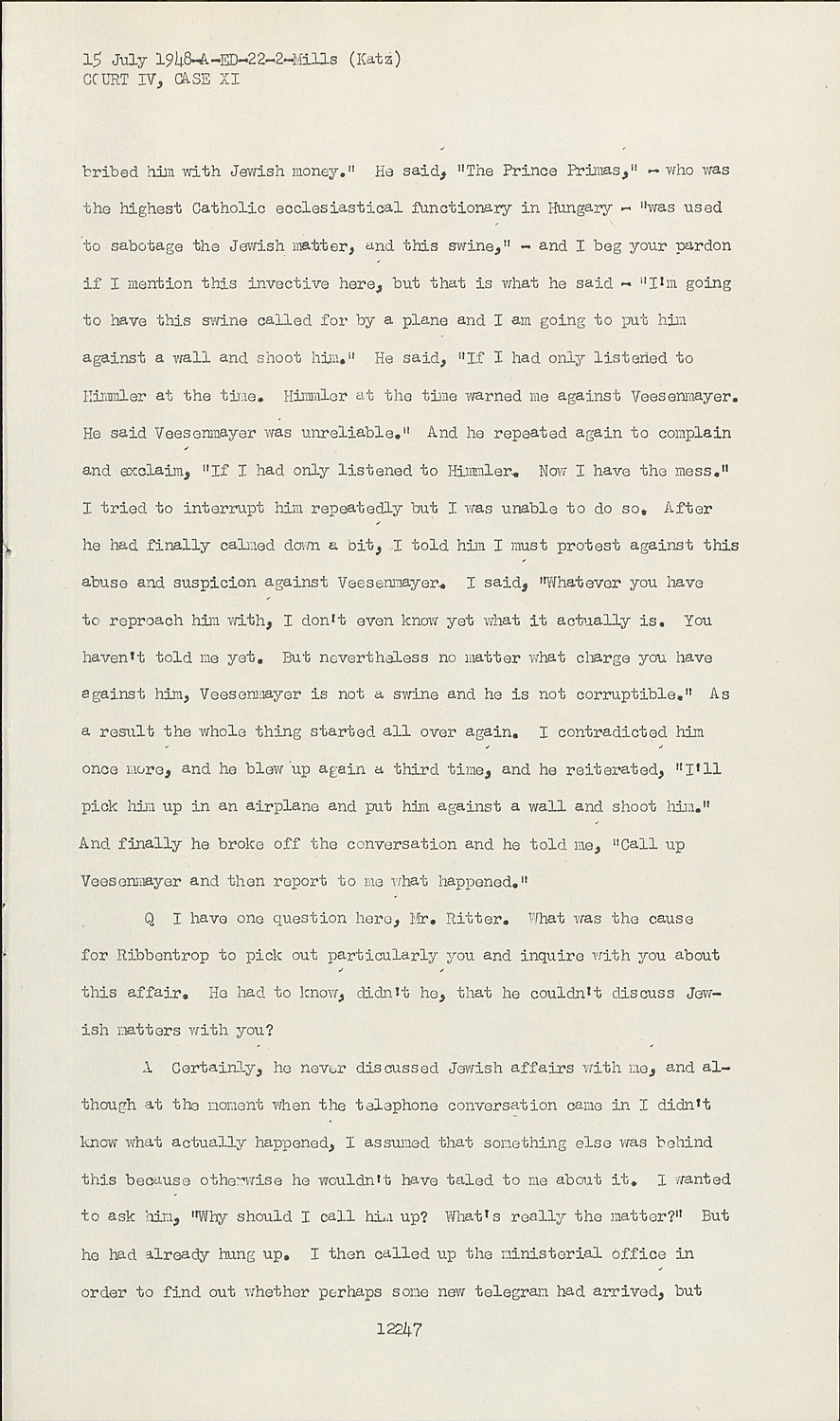 He said, "The Prince Primas," - who was the highest Catholic ecclesiastical functionary in Hungary - "was used to sabotage the Jewish matter, and this swine," - and I beg your pardon if I mention this invective here, but that is what he said - "I'm going to have this swine called for by a plane and I am going to put him against a wall and shoot him." He said, "If I had only listened to Himmler at the time. Himmler at the time warned me against Veesenmayer. He said Veesenmayer was unreliable." And he repeated again to complain and exclaim, "If I had only listened to Himmler. Now I have the mess." I tried to interrupt him repeatedly but I was unable to do so. After he had finally calmed down a bit, I told him I must protest against this abuse and suspicion against Veesenmayer. I said, "Whatever you have to reproach him with, I don't even know yet what it actually is. You haven't told me yet. But nevertheless no matter what charge you have against him, Veesenmayer is not a swine and he is not corruptible." As a result the whole thing started all over again. I contradicted him once more, and he blew up again a third time, and he reiterated, "I'll pick him up in an airplane and put him against a wall and shoot him." And finally he broke off the conversation and he told me, "Call up Veesenmayer and then report to me what happened."