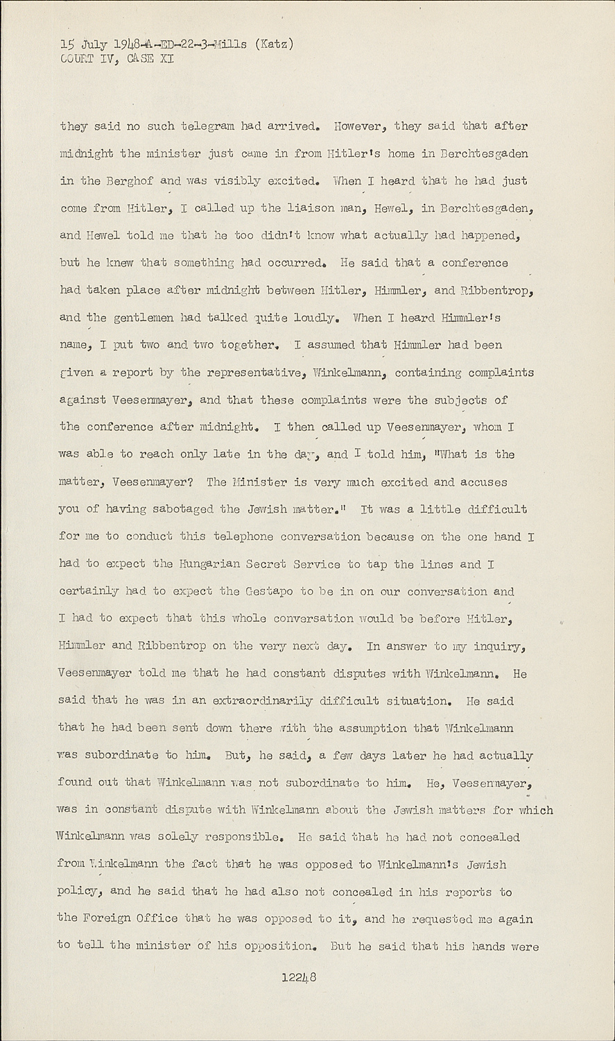However, they said that after midnight the minister just came in from Hitler's home in Berchtesgaden in the Berghof and was visibly excited. When I heard that he had just come from Hitler, I called up the liaison man, Hewel, in Berchtesgaden, and Hewel told me that he too didn't know what actually had happened, but he knew that something had occurred. He said that a conference had taken place after midnight between Hitler, Himmler, and Ribbentrop, and the gentlemen had talked quite loudly. When I heard Himmler's name, I put two and two together. I assumed that Himmler had been given a report by the representative, Winkelmann, containing complaints against Veesenmayer, and that these complaints were the subjects of the conference after midnight. I then called up Veesenmayer, whom I was able to reach only late in the day, and I told him, "What is the matter, Veesenmayer? The Minister is very much excited and accuses you of having sabotaged the Jewish matter." It was a little difficult for me to conduct this telephone conversation because on the one hand I had to expect the Hungarian Secret Service to tap the lines and I certainly had to expect the Gestapo to be in on our conversation and I had to expect that this whole conversation would be before Hitler, Himmler and Ribbentrop on the very next day. In answer to my inquiry, Veesenmayer told me that he had constant disputes with Winkelmann. He said that he was in an extraordinarily difficult situation. He said that he had been sent down there with the assumption that Winkelmann was subordinate to him. But, he said, a few days later he had actually found out that Winkelmann was not subordinate to him. He, Veesenmayer, was in constant dispute with Winkelmann about the Jewish matters for which Winkelmann was solely responsible. He said that he had not concealed from Winkelmann the fact that he was opposed to Winkelmann's Jewish policy, and he said that he had also not concealed in his reports to the Foreign Office that he was opposed to it, and he requested me again to tell the minister of his opposition. But he said that his hands were tied.