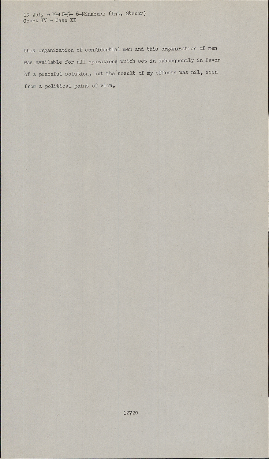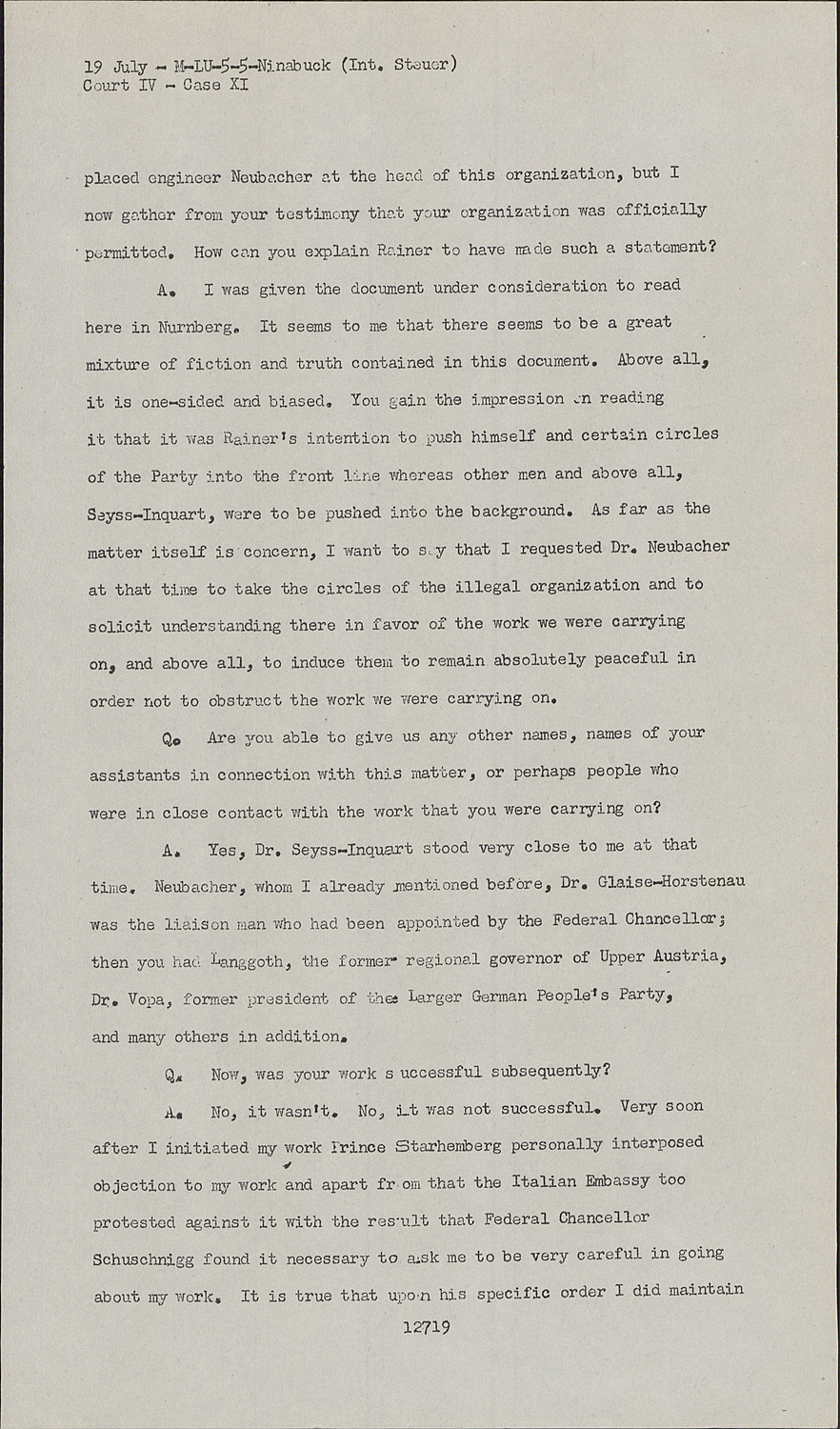 A.I was given the document under consideration to read here in Nurnberg. It seems to me that there seems to be a great mixture of fiction and truth contained in this document. Above all, it is one-sided and biased. You gain the impression on reading it that it was Rainer's intention to push himself and certain circles of the Party into the front line whereas other men and above all, Seyss-Inquart, were to be pushed into the background. As far as the matter itself is concern, I want to say that I requested Dr. Neubacher at that time to take the circles of the illegal organization and to solicit understanding there in favor of the work we were carrying on, and above all, to induce them to remain absolutely peaceful in order not to obstruct the work we were carrying on.