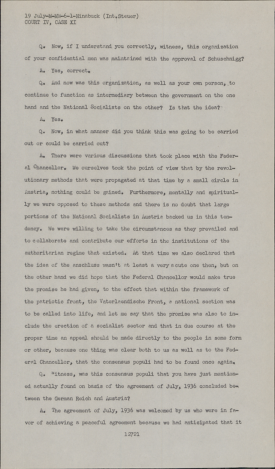 Q.Witness, was this consensus populi that you have just mentioned actually found on basis of the agreement of July, 1936 concluded between the German Reich and Austria?