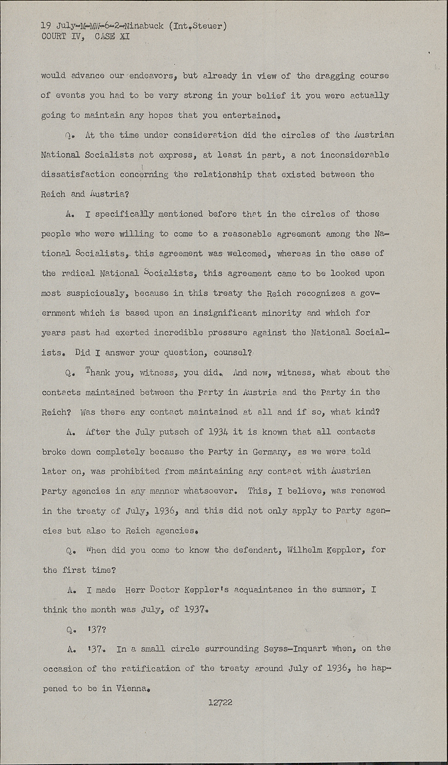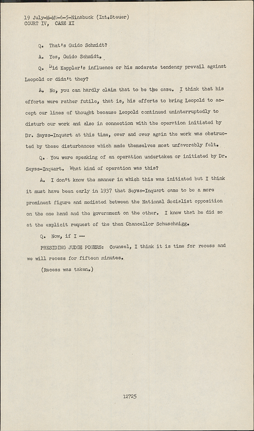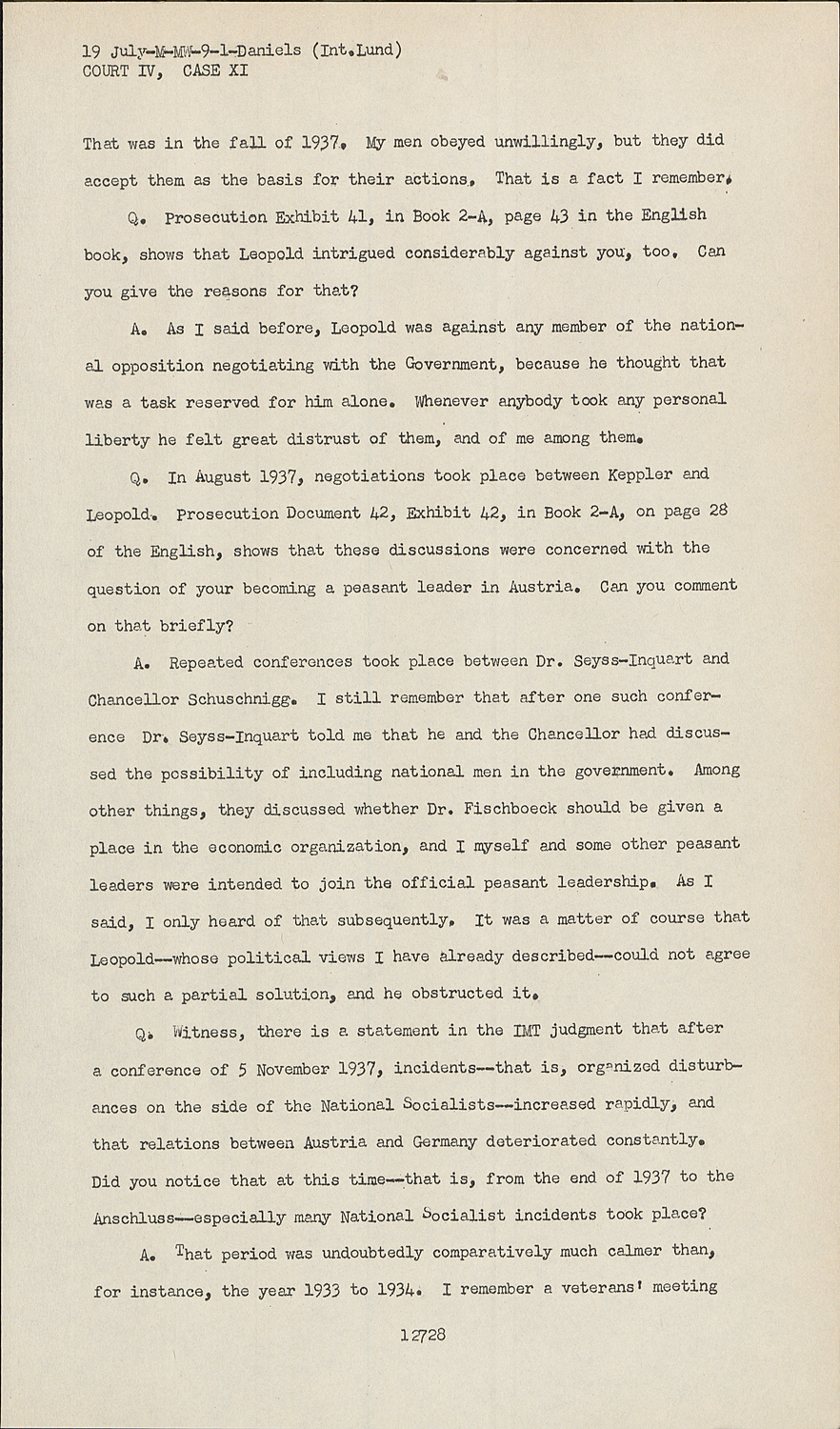 A.I don't know the manner in which this was initiated but I think it must have been early in 1937 that Seyss-Inquart came to be a more prominent figure and mediated between the National Socialist opposition on the one hand and the government on the other. I know that he did so at the explicit request of the then chancellor Schuschnigg.